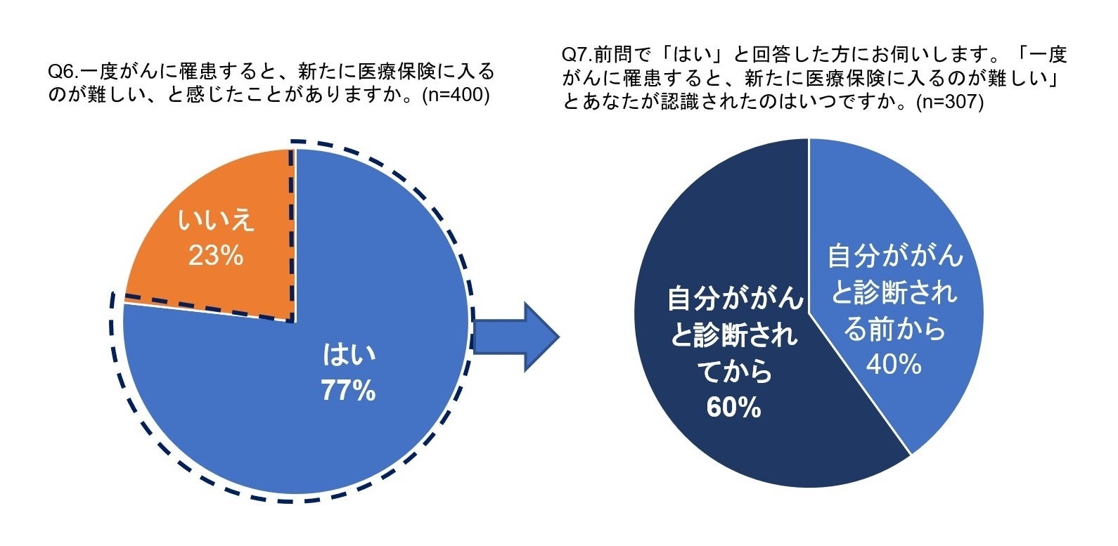 - がん経験者の7割が「一度がんに罹患すると、新たに医療保険に入るのが難しい」と感じており、そのうち6割はそのことを「自分ががんと診断されてから」認識した