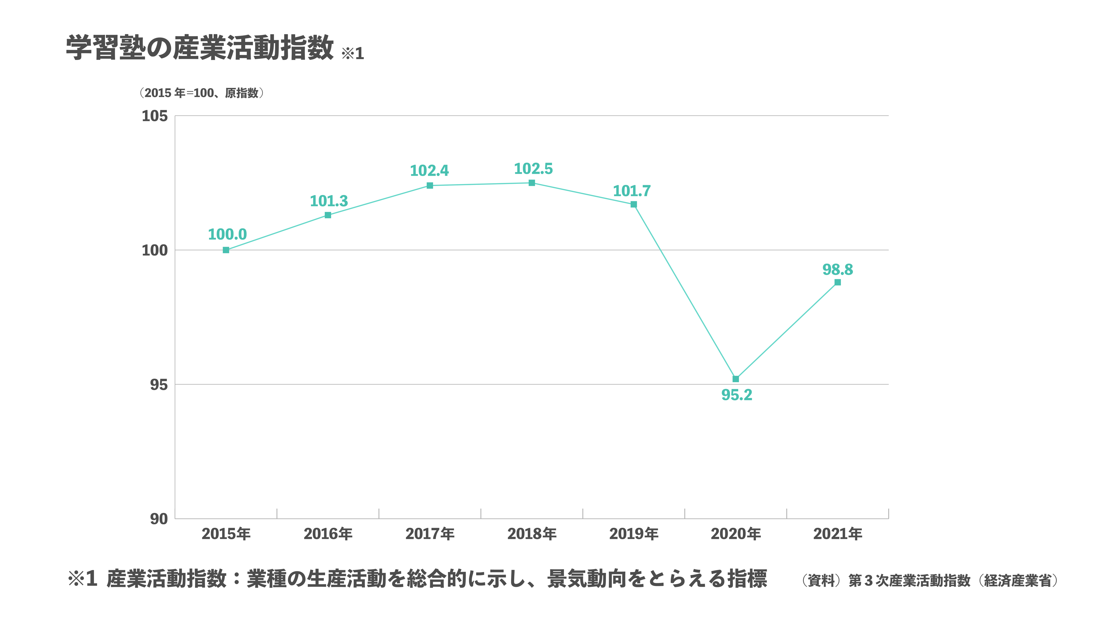 他方、学習塾においては、子供の母数は減少しているものの、子供1人あたりにかける教育費は増加し続けているため、2019年まで学習塾産業の市場規模は横ばいの傾向がみられてきました。