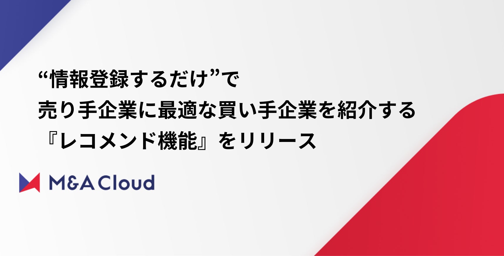 株式会社M&Aクラウド(本社:東京都千代田区、代表取締役CEO:及川厚博、以下「当社」)が提供するM&Aマッチングプラットフォーム「M&Aクラウド」は、売り手企業が登録をした情報と、買い手企業の買収ニーズ情報や過去のマッチング情報を解析し、今後マッチングする可能性が高い買い手企業を生成AIが提案する『レコメンド機能』を開発しました。これにより、売り手企業は情報登録をするだけで、検索する手間なくマッチングする可能性が高い買い手企業の情報を得ることができ、効率的に買い手企業を見つけることが可能になります。本件は「GenerativeAI活用プロジェクト」第5弾です。