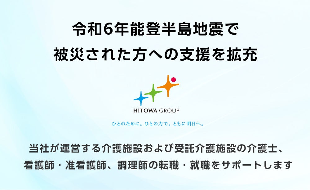 HITOWAグループでは、今回の被災によって、就業の変更や就業予定の変更を余儀なくされた方に、1月より当社が運営する保育園への保育士、栄養士、調理師、看護師の就職・転職の受け入れをサポートしておりますが、このたび、介護施設の介護士、看護師・准看護師、受託介護施設の調理師に対象を広げ、サポートすることとなりました。