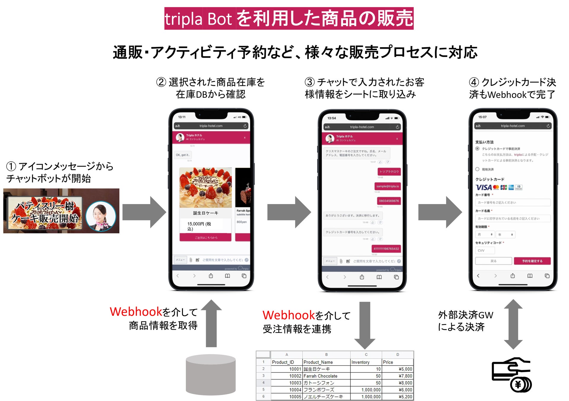 この度、tripla Botに既に搭載されているカスタムボット機能に、クレジットカード決済プロセスを任意で設定できるようになりました。これにより、イベント予約や商品注文など、様々な決済フローをチャットで実現可能になり、EC機能が無いホームページにおいても、tripla Botを導入するだけで、追加料金を支払うこと無くEC機能がご利用いただけるようになります。
