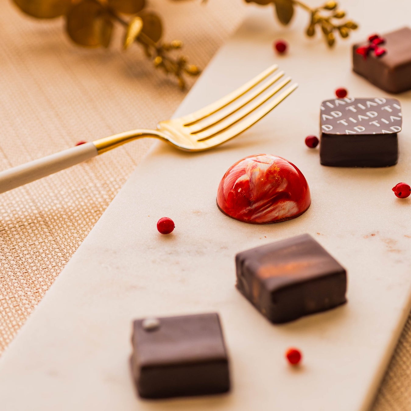 モルトンブラウンの「ピンクペッパーコレクション」にインスパイアされたTIADオリジナルの限定ショコラ。ピンクペッパーを練りこんだラズベリーとライチのコンフィチュール、ジンジャーとラズベリー、苺のガナッシュクリームを使った一粒は、カカオの芳醇な香り、ラズベリーの甘酸っぱさとライチのエキゾチックな香りが口いっぱいに広がります。さらにジンジャーの爽やかな辛みがラズベリーと苺の甘酸っぱさを引き立て、軽やかな甘さを演出します。このショコラのクライマックスは、"丸ごと使われたピンクペッパー"。口の中でピリリと弾け、味覚だけでなく嗅覚にも響く、忘れられない余韻を残します。