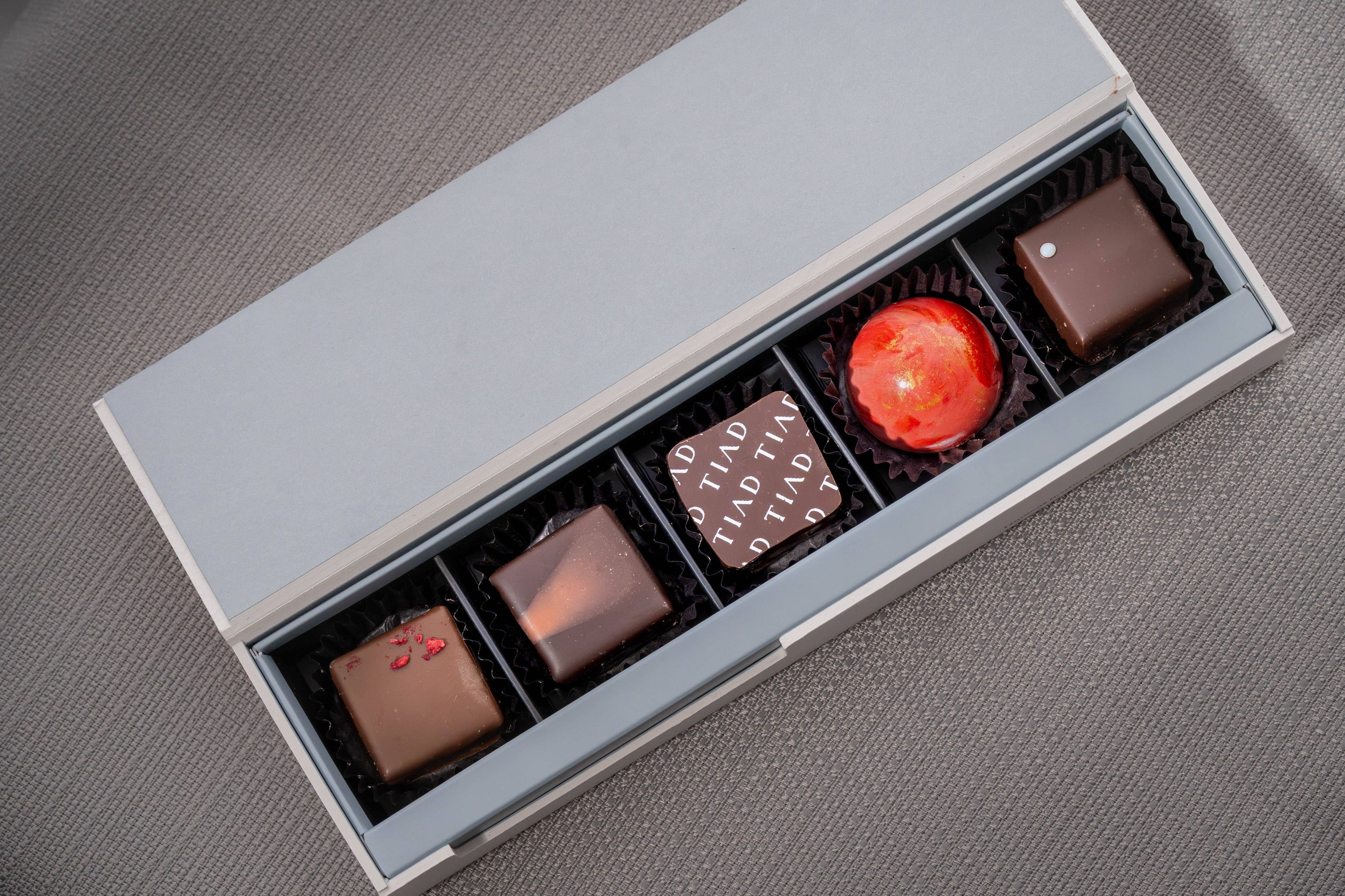 爽やかなフレッシュミントの香りのガナッシュと、カカオ本来の風味を追求したビターガナッシュの邂逅が新鮮な味わい。TIADブルーをアクセントに。