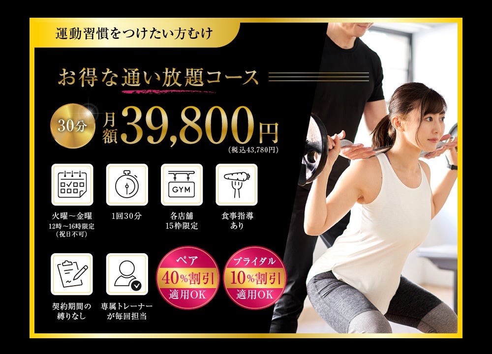 1回30分なので無理なく運動習慣をつけるのに最適な時短パーソナルとなります(火曜〜金曜の12時〜16時限定。祝日・年末年始・お盆休みを除く)。