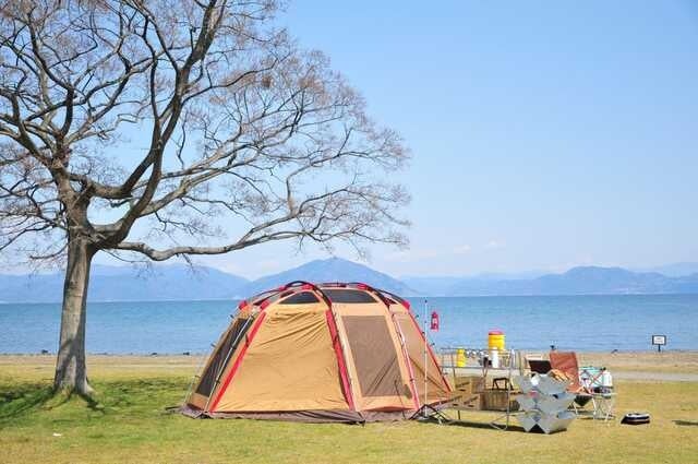 滋賀県高島市の琵琶湖岸に広がる、開放感あふれる湖畔オートキャンプ場。