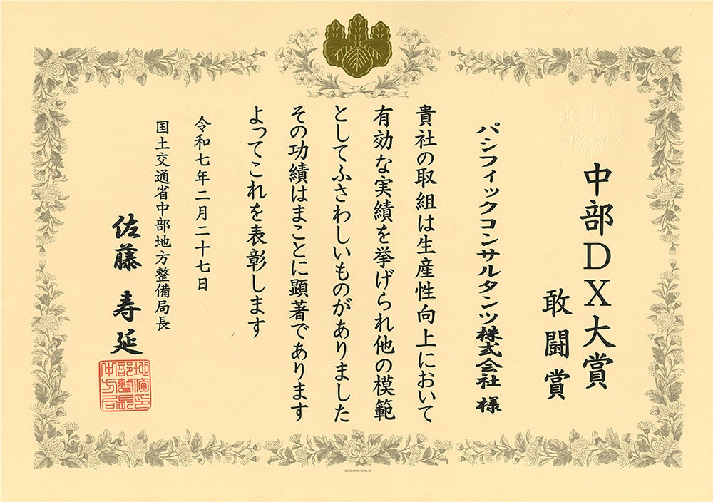 パシフィックコンサルタンツ株式会社(住所:東京都千代田区、代表取締役社長執行役員:大本 修)は国土交通省 中部地方整備局が主催する令和6年度 中部DX大賞にて「水防災業務支援システム」による出水時対応の省力化の取り組みで敢闘賞を受賞しました。