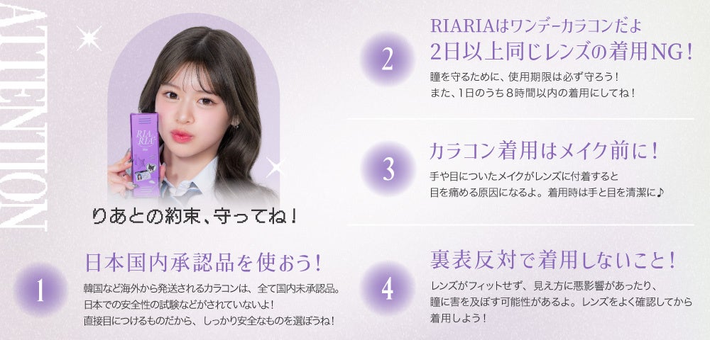 『RIARIA』は、ずっと変わらず可愛く盛れるように、全カラー『回らない水光カラコン』がポイント。りあちゃんがリアルに“欲しい!”と思ったレンズデザインが完成しました。