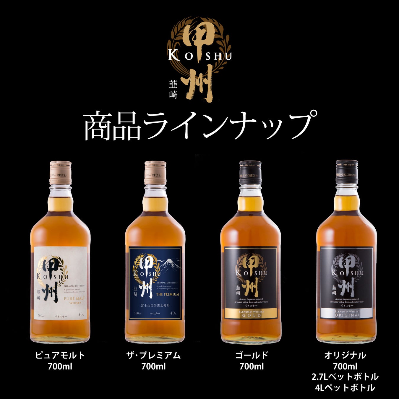 甲州韮崎ウイスキーは、美しい森と清流に囲まれた甲州韮崎の地で生まれたブランドです。雄大な自然が織りなす中で湧き出た清らかな水とともにじっくり丁寧に熟成・ブレンドされたウイスキーとして2016年1月に発売しました。現在は「ピュアモルト」「ザ・プレミアム」「ゴールド」「オリジナル」の4シリーズで展開しています。気軽に楽しめる日本産ウイスキーブランドとして、毎日の生活に豊かな彩を加え、幅広い飲用シーンで楽しめる商品です。