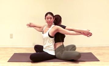 背中を合わせて安座で座り、両腕を伸ばしたら、手首を絡めて、手のひら同士を合わせます。吸う息で背筋を伸ばし、吐く息で右からツイストしていきます。相手の呼吸や、背中の温かさを感じましょう。
