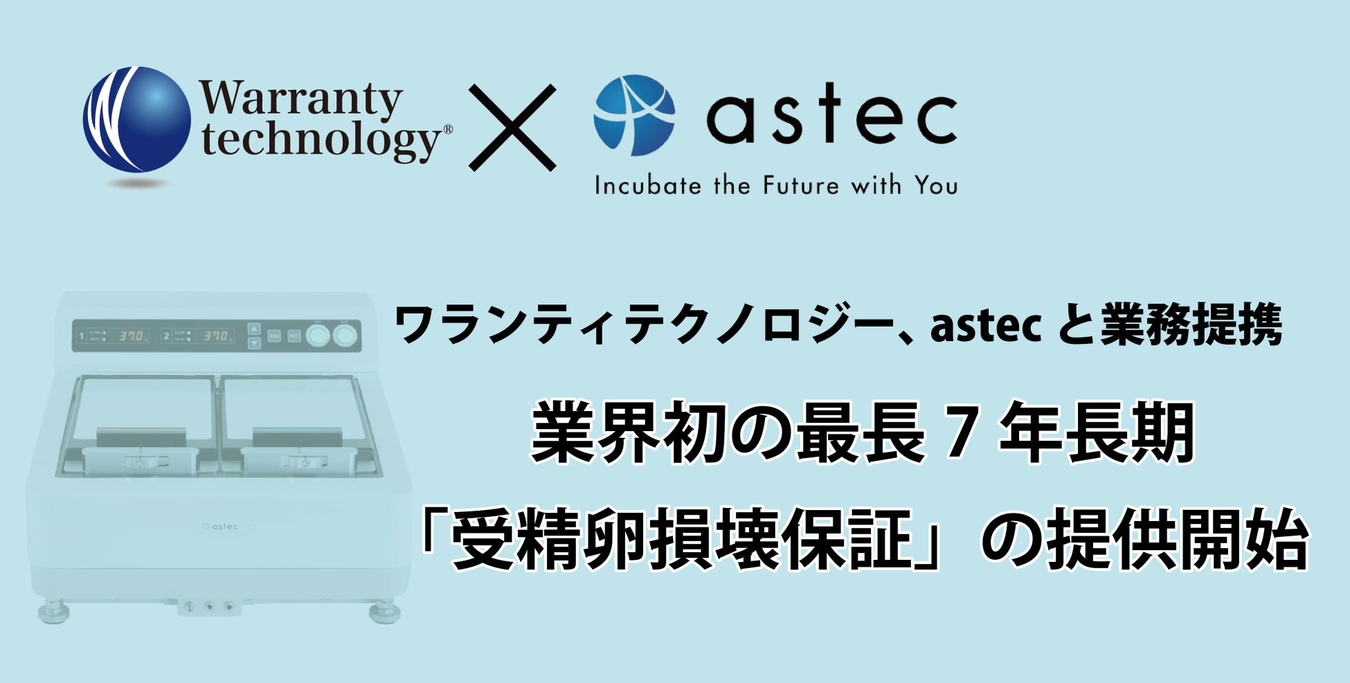 延長保証サービスの構築・運営を行う株式会社Warranty technology(本社:東京都千代田区、代表取締役CEO:宮原 年明、以下「ワランティテクノロジー」)は、株式会社アステック(所在地:福岡県糟屋郡、代表取締役社長:園田 勝裕、以下「アステック」)と業務委託を締結し、業界初の最長7年長期インキュベーター機器の保証サービスを提供いたします。さらに、同機器の保証サービスにご加入いただくと、受精卵損壊保証も併せてご利用いただけます。