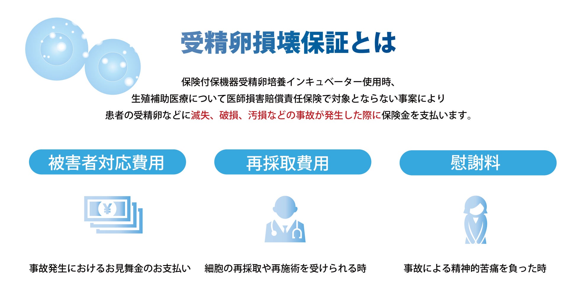生殖補助医療の一環で使用される受精卵培養インキュベーターの故障による受精卵の破損、滅失、汚損等の事故に対して、補償金を支払います。医師損害賠償責任保険ではカバーされない事案を補填いただけます。