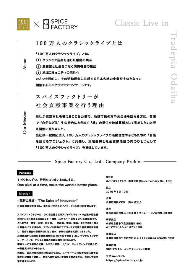 デジタル・トランスフォーメーションを⽀援するスパイスファクトリー株式会社(本社:東京都港区、代表取締役CEO:高木 広之介)は一般財団法人100万人のクラシックライブ(所在地:東京都千代田区、代表理事:蓑田 秀策)の活動理念に共感し、この活動を推進しております。