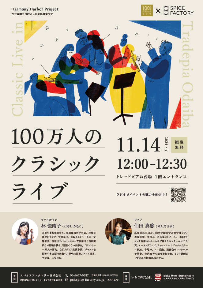 この度、スパイスファクトリー主催のもと、2024年11月14日(木)に当社の入居しているトレードピアお台場にて、第2回目となる100万人のクラシックライブを開催いたします。本イベントは地域や近隣企業との交流を深める取り組みの一環であり、ビルオーナーであるいちご株式会社様の主催するテナント企業交流会「Meet the Neighbors!」と合わせて開催いたします。この取り組みを進めるにあたり、いちご株式会社様には多大なるご支援をいただいております。