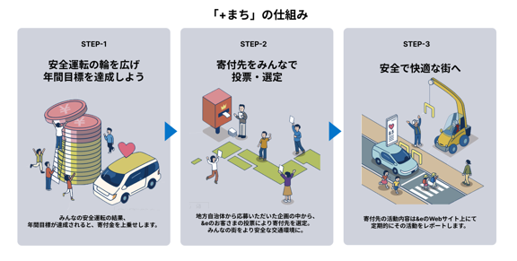「+まち」とは、「事故時の安心だけでなく、事故のない世界そのものを、お客さまと共創する。」をミッションに掲げる「&e」において、「安全な交通環境・社会の実現」をテーマに地方自治体から企画を募集し、お客さまの投票によって企画を選定し、お客さまの事故率に応じて当社が寄付を行う活動です。