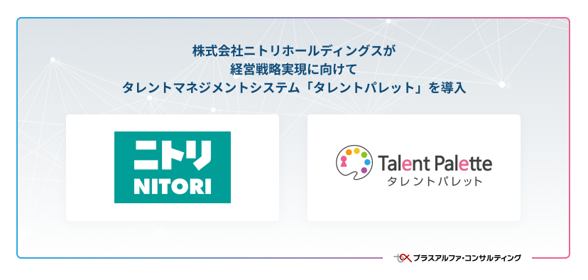株式会社プラスアルファ・コンサルティング(本社:東京都港区、代表取締役社長:三室克哉 証券コード:4071)は、科学的な人材活用や人的資本の開示、人事業務のDX化、リスキリングの推進などを背景に、多くの企業で導入が進んでいるタレントマネジメントシステム「Talent Palette(以下:タレントパレット)」を株式会社ニトリホールディングス(本社:札幌市北区、代表取締役社長:白井 俊之、以下「ニトリ」)にご導入いただきましたことをお知らせします。