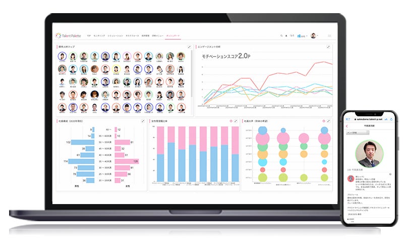 「タレントパレット(https://www.talent-palette.com/)」は、人材戦略に必須となる採用から育成、配置、評価、抜擢・活躍までを一気通貫で行い、人材情報を活用した科学的人事戦略を実現するタレントマネジメントシステムです。当社はこれまで3,000社超のビッグデータ活用支援を行ってきた実績があり、そこで磨き上げたデータ活用技術のノウハウを活かしています。タレントパレットの導入法人数は約2,000社を超え(契約社数990社、22年9月末時点)従来は管理するのみに留まっていた人材情報を分析し、そのデータを網羅的に活用することで経営層の意思決定を後押しします。具体的には人事情報、経歴、スキル、マインド(適性)、社員の希望や想い、日々のモチベーションやエンゲージメント、ヘルスケア(健康)までのデータを集約・活用することができます。これらのデータを分析することにより異動シミュレーションや研修まで含めた人材育成、テキストマイニングを活かした離職予兆の抽出、採用ミスマッチ防止、人的資本KPIのモニタリングなど、あらゆる人事戦略においてデータを活用した科学的人事戦略を実現します。