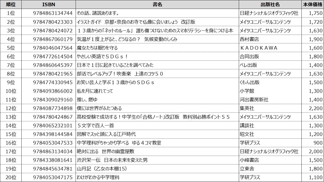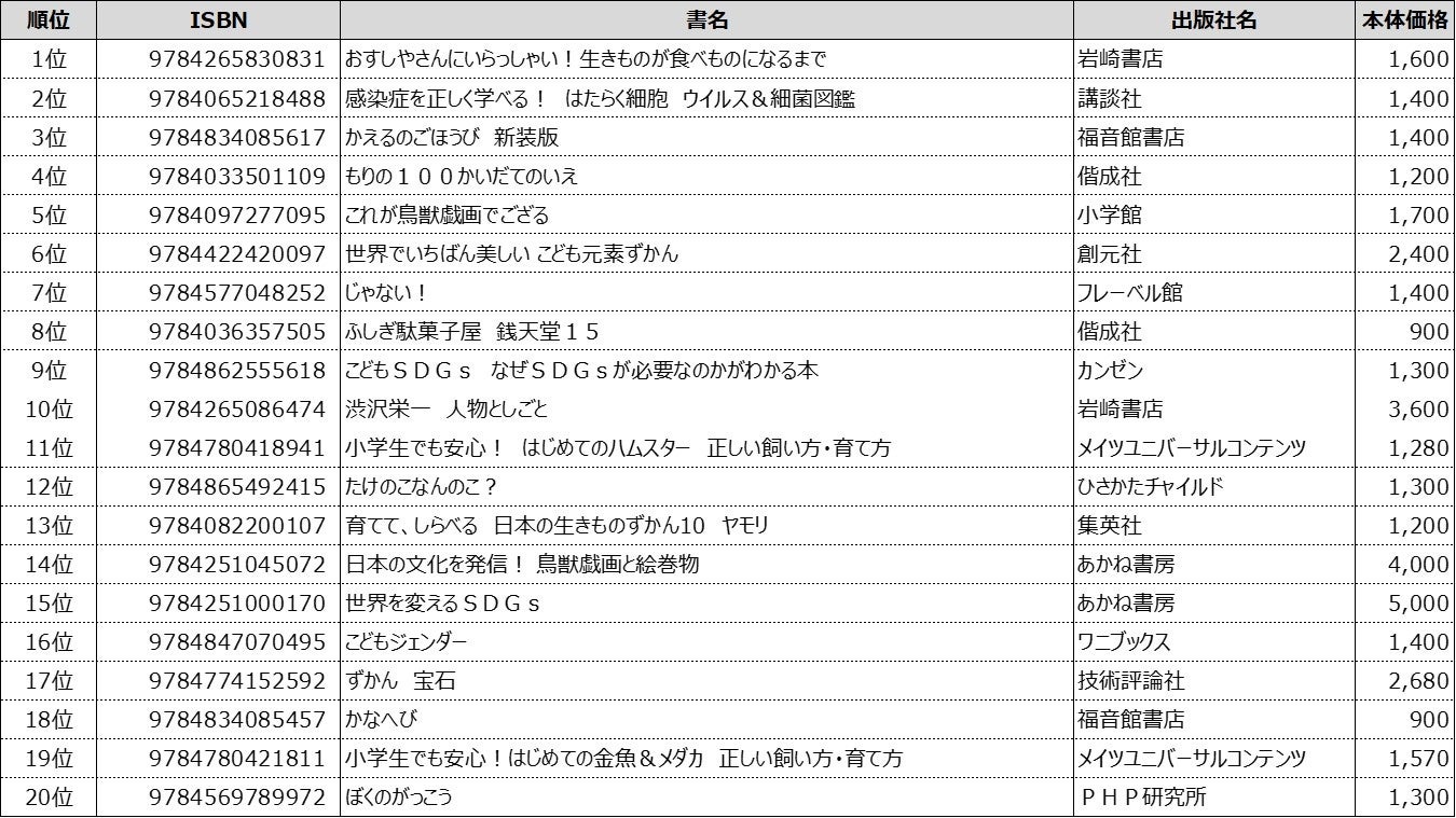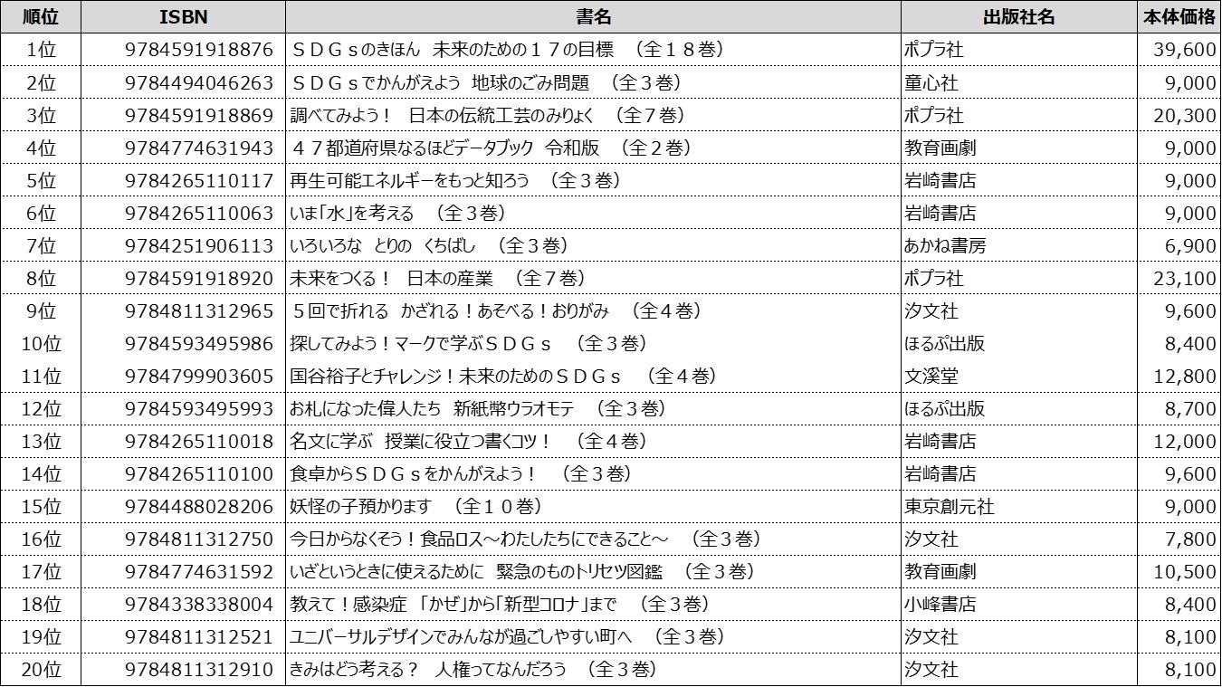 セット部門第1位は、『SDGsのきほん 未来のための17の目標』(ポプラ社)でした。上位20位内の約半数がSDGs関連図書となり、昨年に引き続き、SDGsへの関心の高さがうかがえる結果となりました。