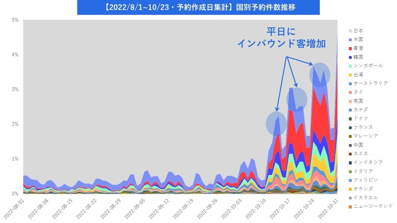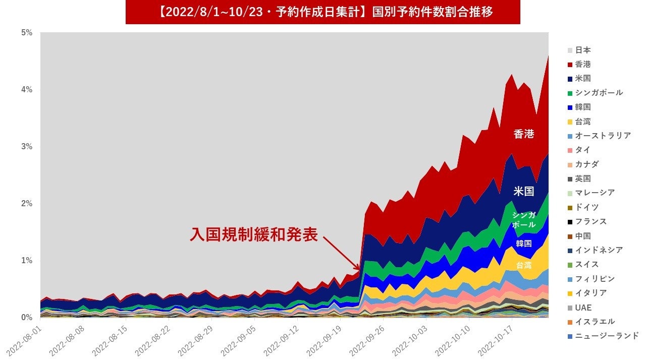 2022年8月1日から10月23日までの予約作成日時点集計・国別予約件数割合。ユーザーが予約した場所で国を判別、以下同
