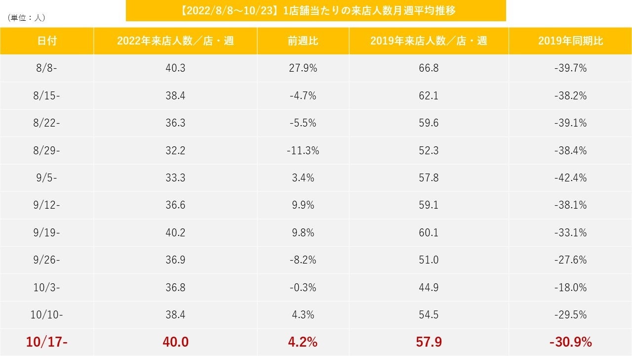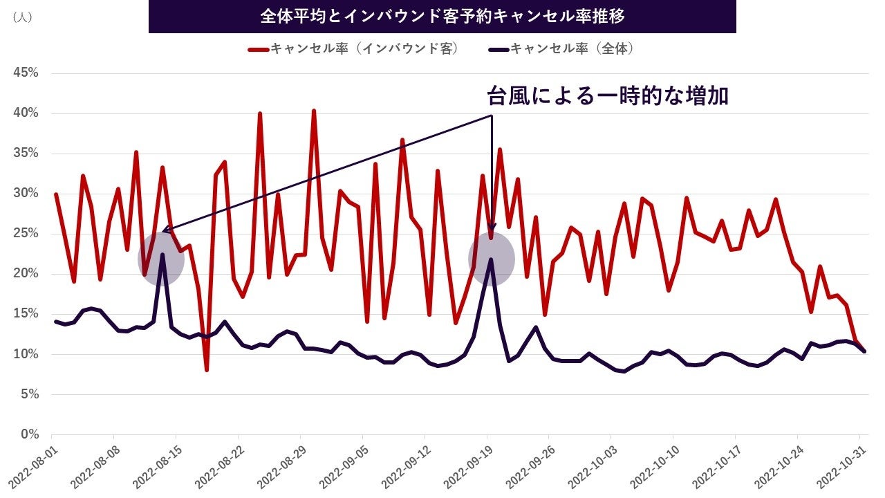 2022年8月1日から10月23日までのインバウンド客と全体平均キャンセル率推移