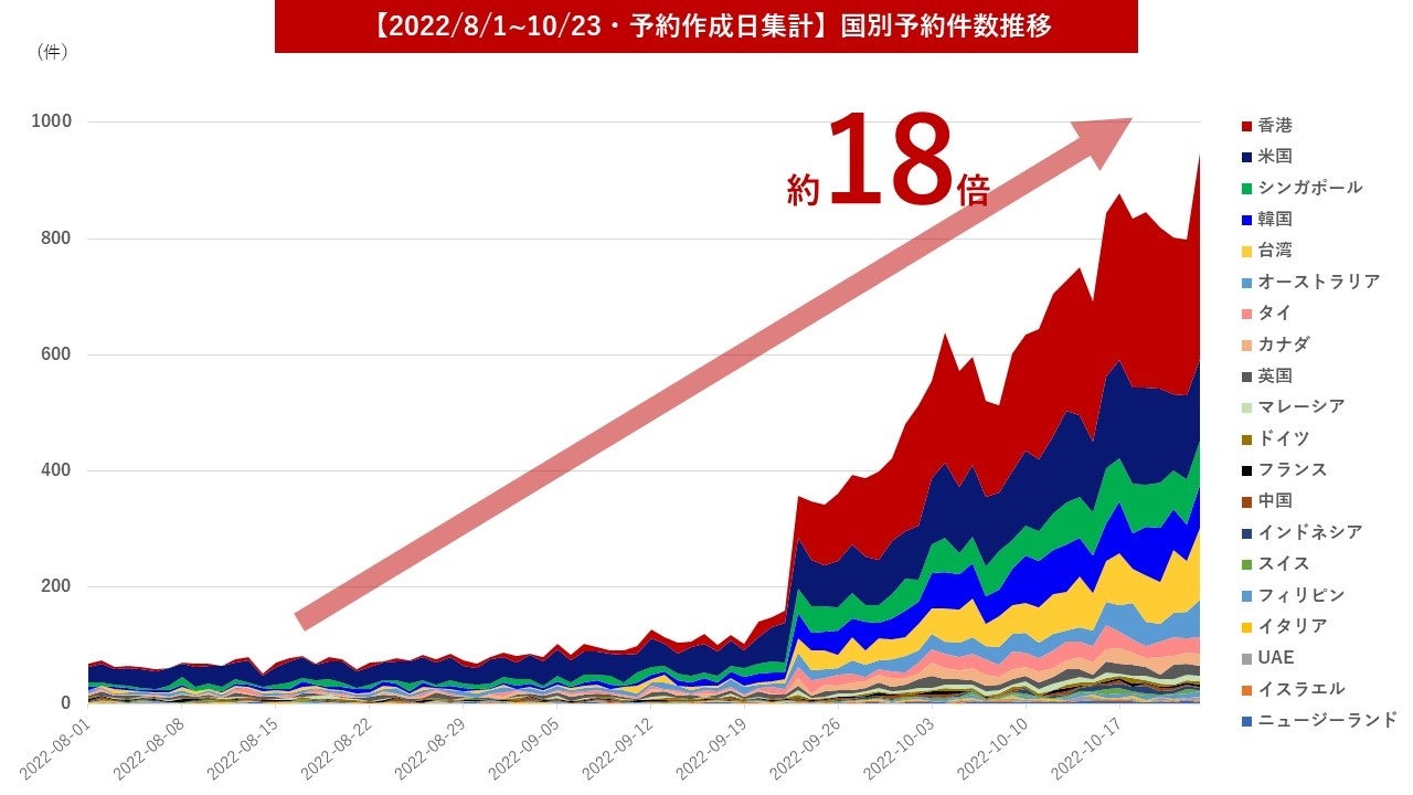 入国規制緩和で入国者数の上限撤廃が発表された先月22日を境に外国人による予約が急増。今年8月1日以降の「予約作成時点」で集計した予約データを見ると、8月15日に底を打ったインバウンド客の予約件数は9月22日から一気に増加をはじめ、10月23日(最新)のピークと比較すると約18倍にまで膨らんでいます。