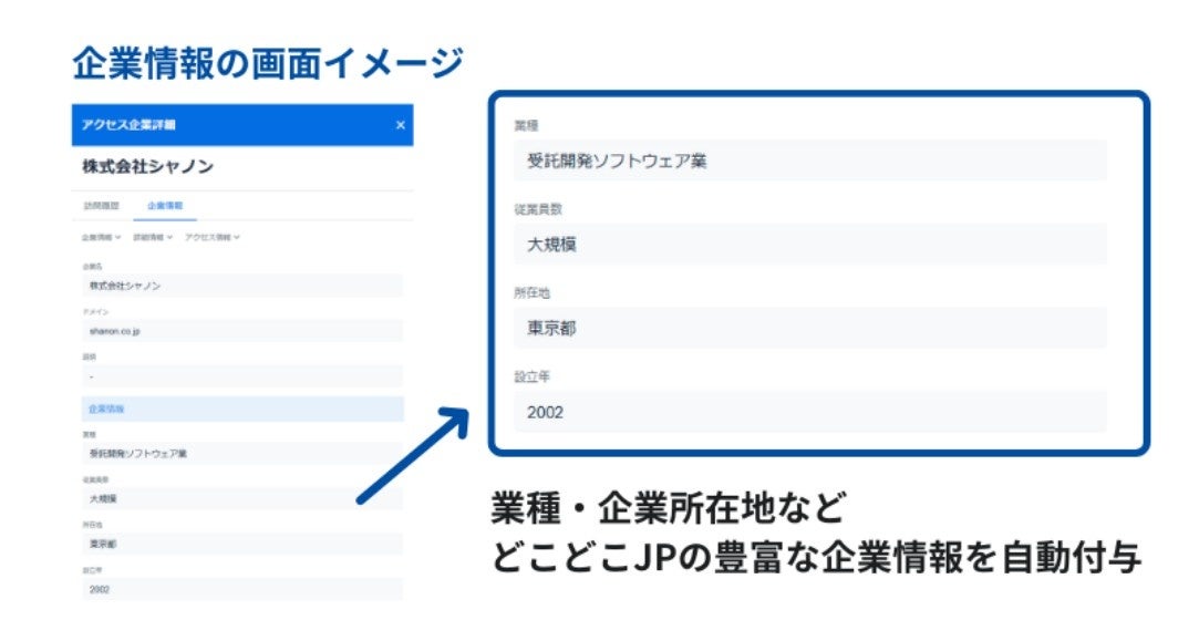 このたび、シャノンが提供するMAツール「シャノンMA」に当社のIPアドレスデータベース「どこどこJP」が実装されることで、IPアドレスからアクセス元企業の情報を把握することが可能となり、企業単位でのWeb行動分析を実現します。