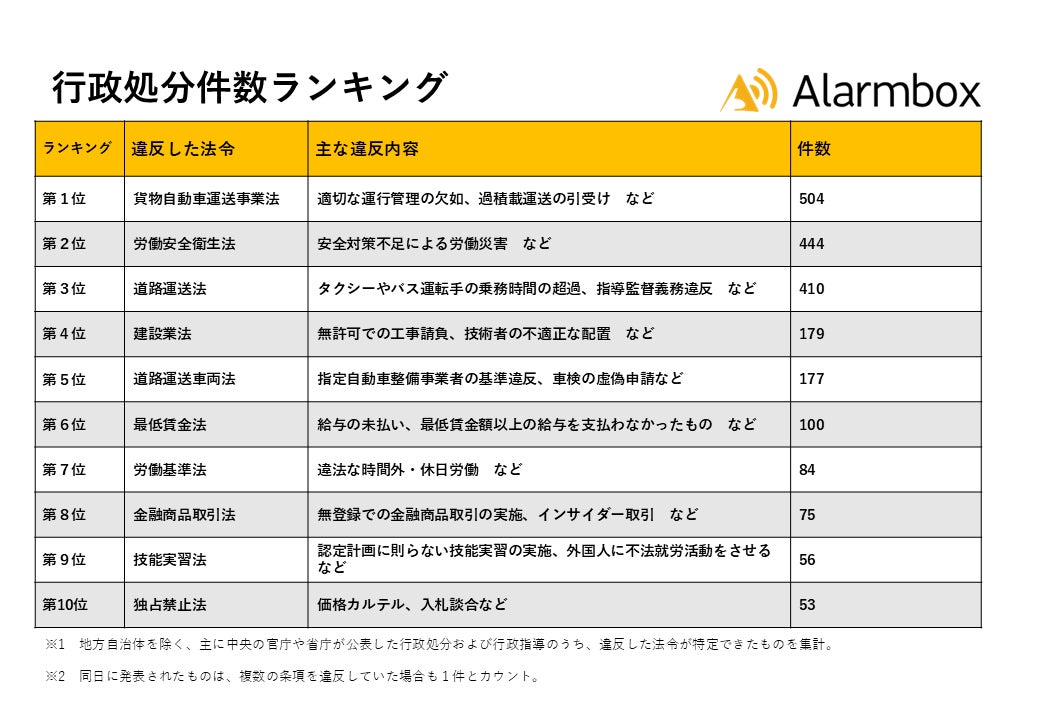 AI与信管理サービスを提供するアラームボックス株式会社(本社:東京都新宿区、代表取締役:武田浩和、以下「当社」)は、この度、2023年9月1日~2024年8月31日に官公庁が公表した2,430件の行政処分および行政指導を対象に、根拠となった法令を調査し「行政処分件数ランキング」を集計しましたので発表します。