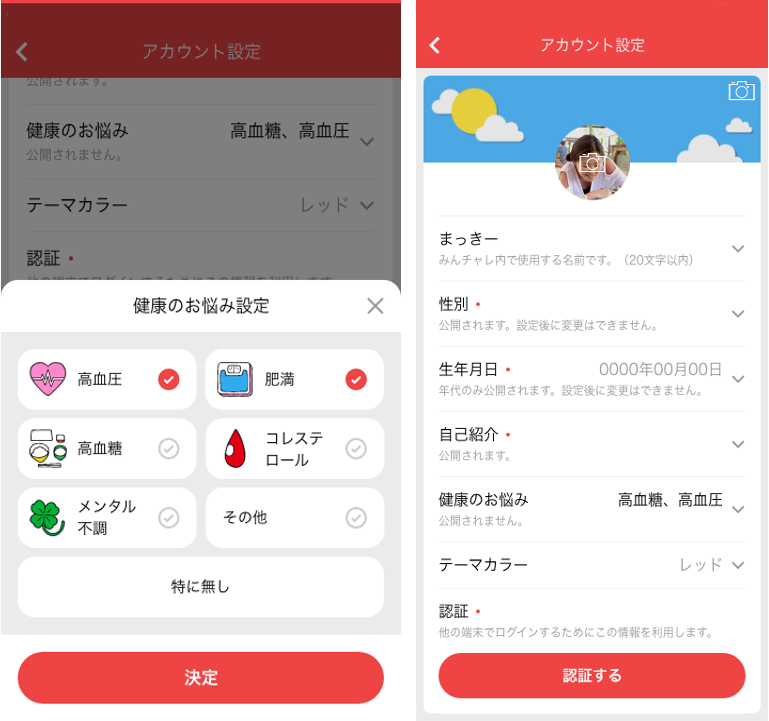 アプリダウンロード後のチャット形式のチュートリアル画面、もしくはプロフィール画面よりご自身の健康のお悩みを設定できます。