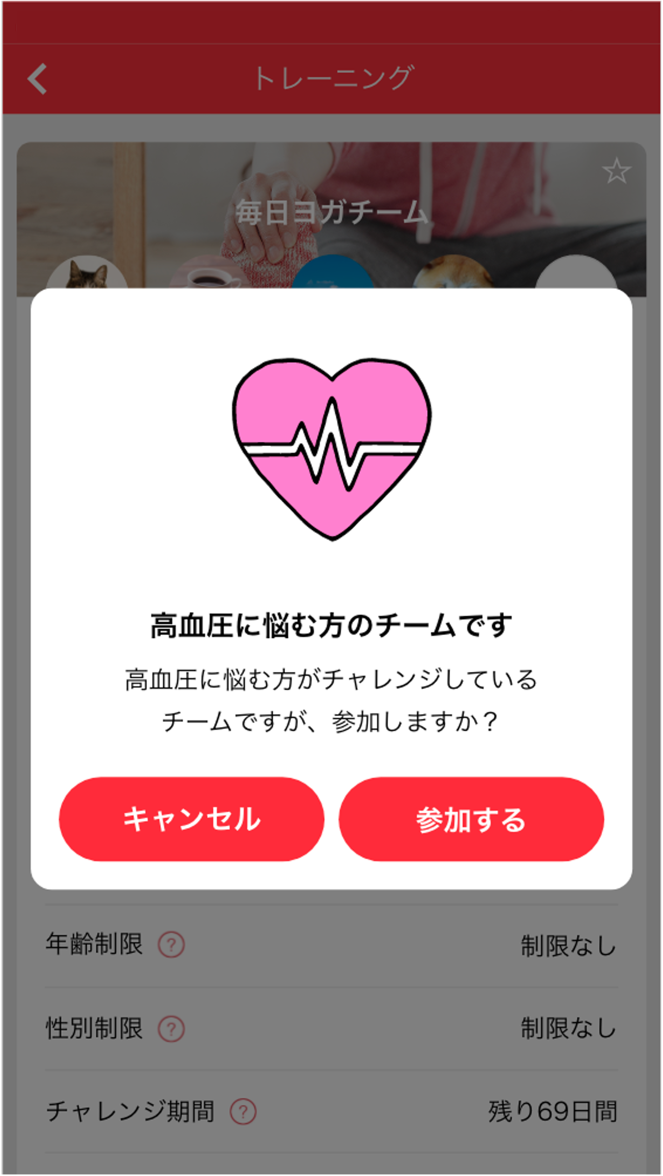 ※自分の設定した健康の悩みとは違う悩みが設定されたチームに参加することもできますが、確認画面が表示されます。
