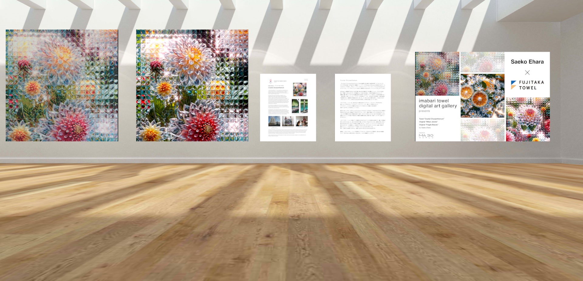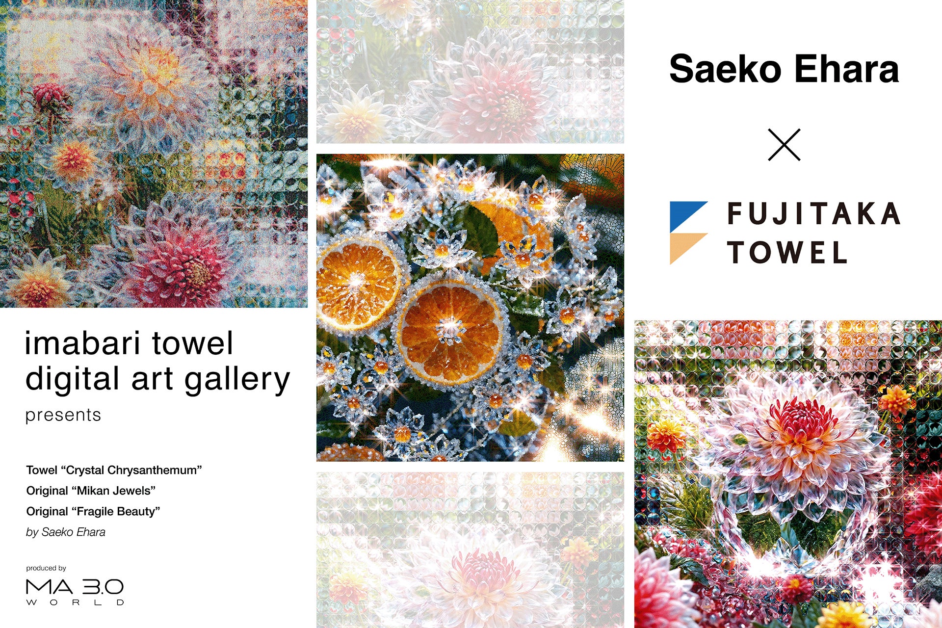 今回のコラボは、今治タオル デジタルアートギャラリー開設にあたり、“タオル・今治”をコンセプトとするデジタルアートを江原氏が制作したことを機に、株式会社藤高の世界初のフルカラージャカードタオル「五彩織り」と出会ったのがキッカケで、江原氏の“キラキラ”デジタルアートと「五彩織り」の親和性が高いことに着目。約1年の構想を経て、江原氏のスイス個展で発表する額装タオル「Crystal Chrysanthemum」と、愛媛にちなんだ“みかん柄”の一般向け限定商品「Mikan Jewels」を開発。デジタルアートギャラリー内でもデジタルアートを展示するほか、額装タオルの巡回も計画しています。