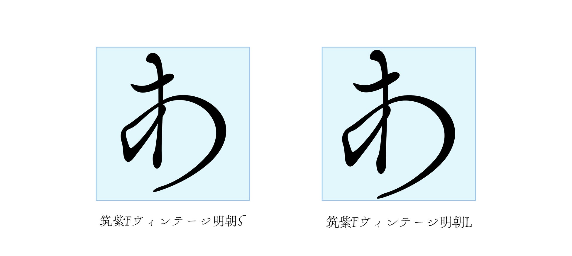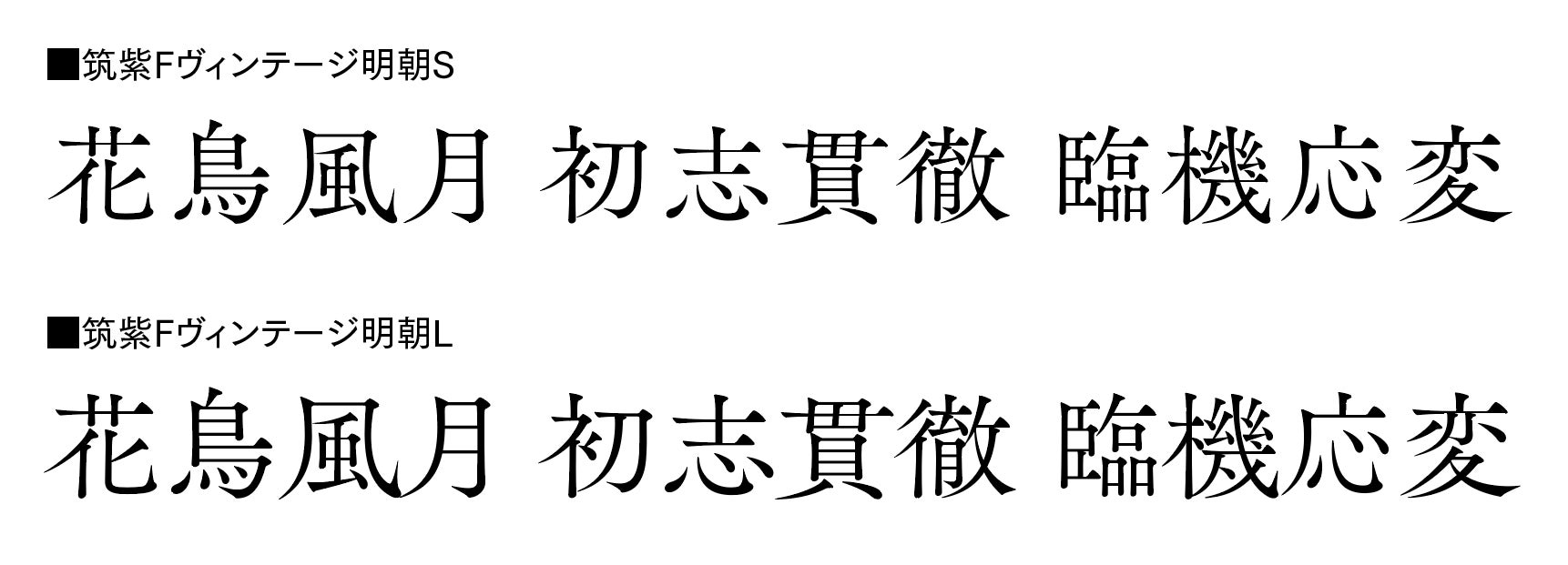 従来の筑紫ヴィンテージ明朝の漢字の細い部分をより薄く、細く見えるように処理をし繊細さを表現しています。また、自筆のペン書きフォルムによる仮名デザインで手書きの躍動感を、引き締まったフォルムと細く長く伸びやかなストロークで優雅さを表現しています。文字の大きさの違いにより、S(スモール)とL(ラージ)の2種類があります。