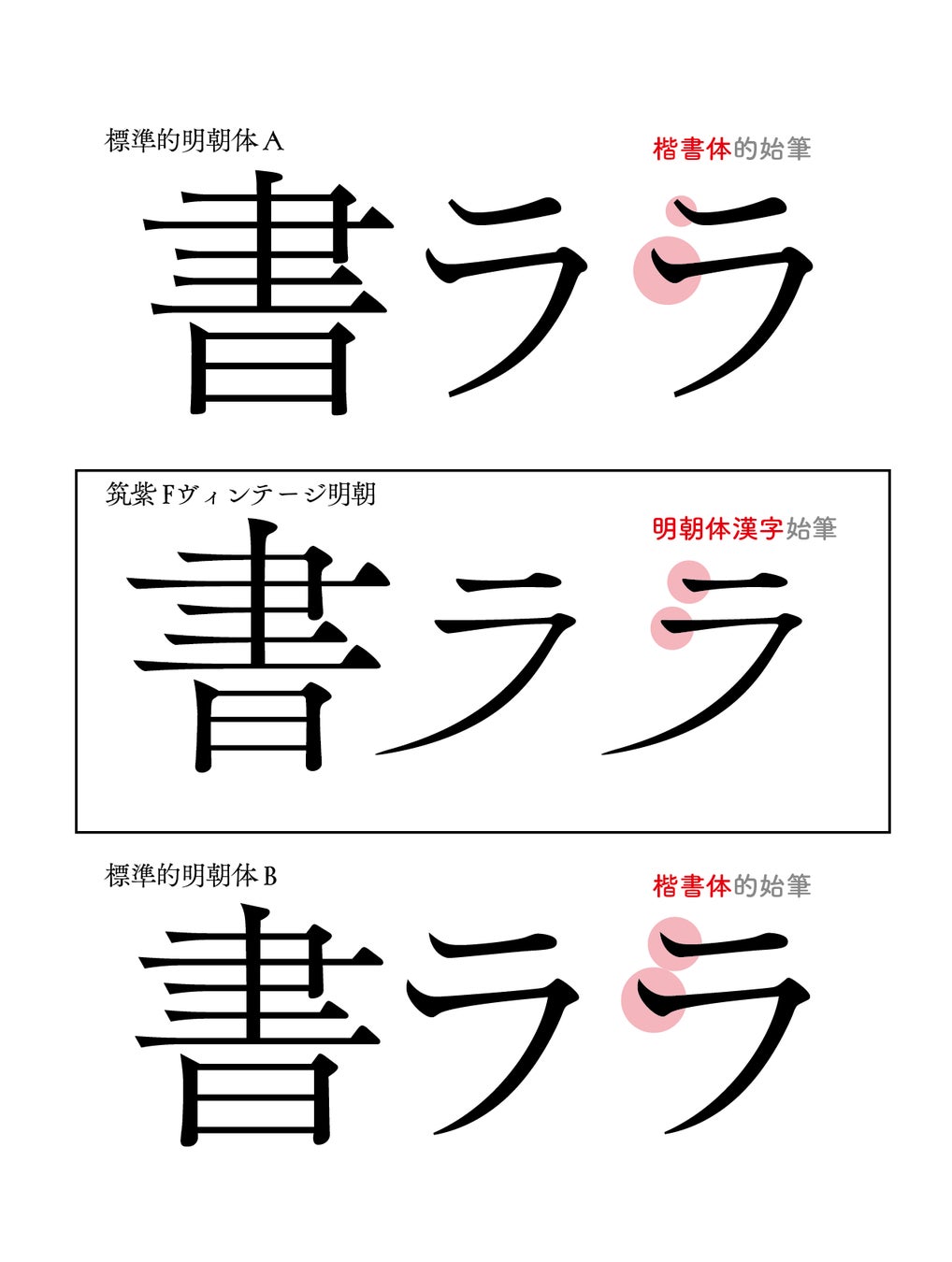 カタカナの横画における始筆部が独特な点も筑紫Fヴィンテージ明朝の特長です。スタンダードな明朝体の始筆部は、45度ほどの角度がついているものが多いですが、本書体はそれに比べると滑らかで漢字の横画のような剛直な印象をうけます。文章を組むと、これまでにないユニークな視覚的効果を与えます。また、本書体の魅力である伸びやかなストロークは、カタカナの左ハライでも活きており、制作した書体デザイナー 藤田重信は「筑紫の中でも最も優雅なカタカナです」と語ります。