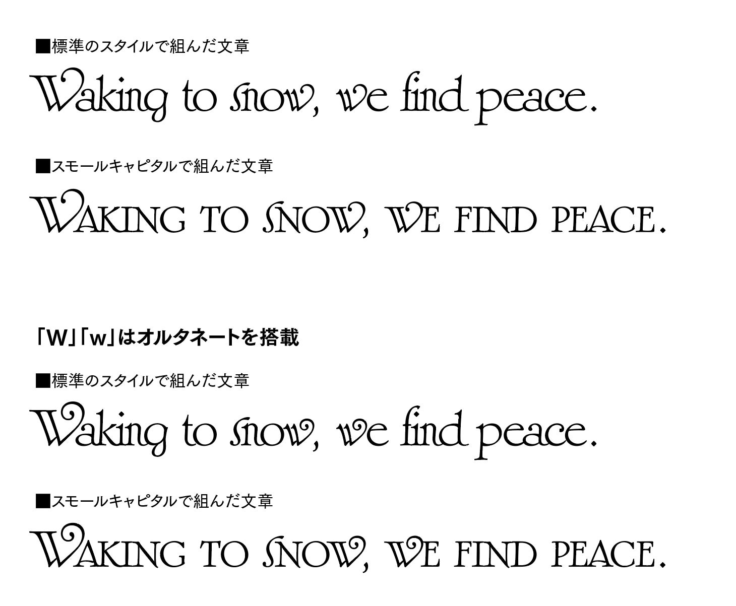 筑紫Fヴィンテージ明朝の付属欧文は華やかな優美さが特長です。「W」「w」の2文字は巻きが強いオルタネート(異字体)を搭載。用途に応じての使い分けが可能です。