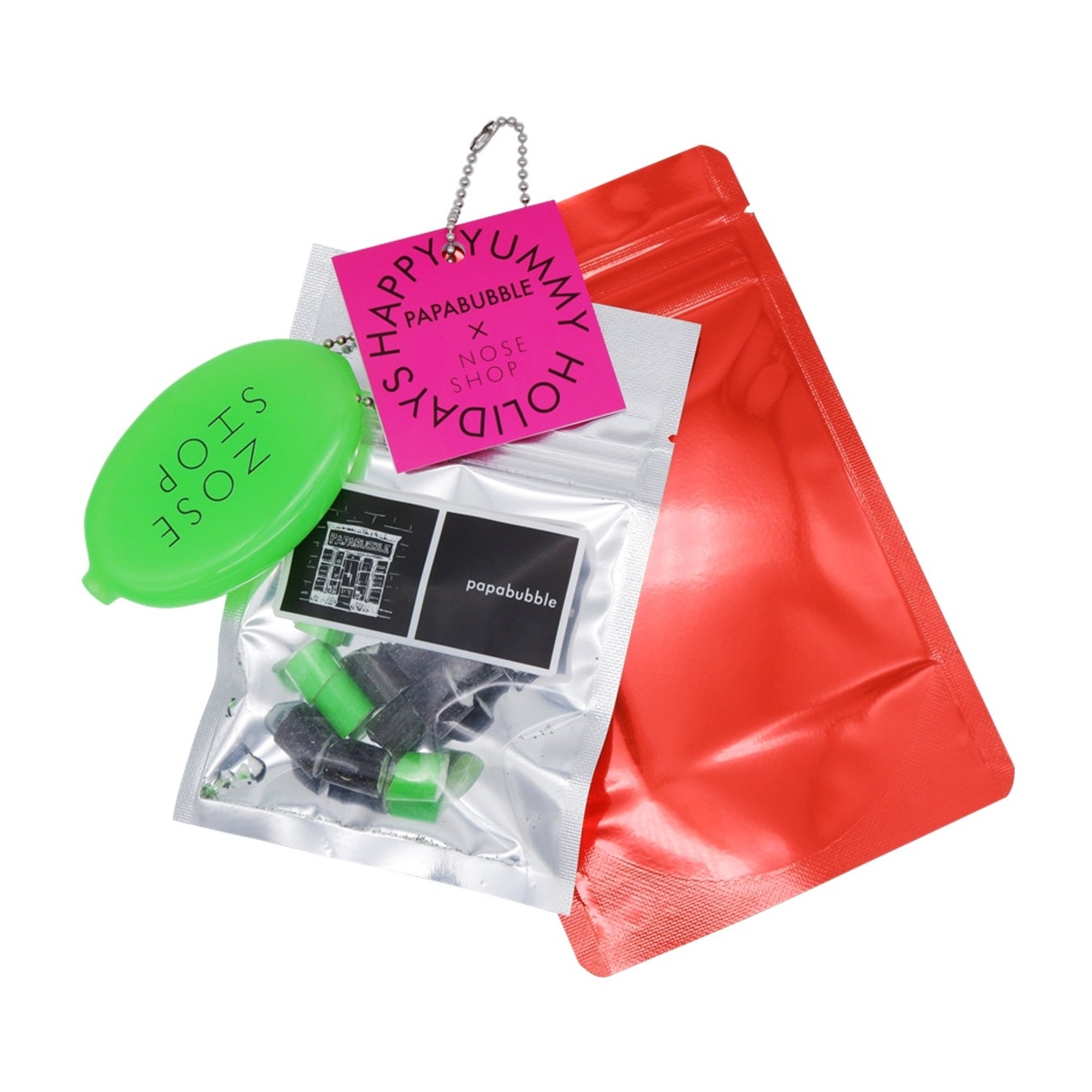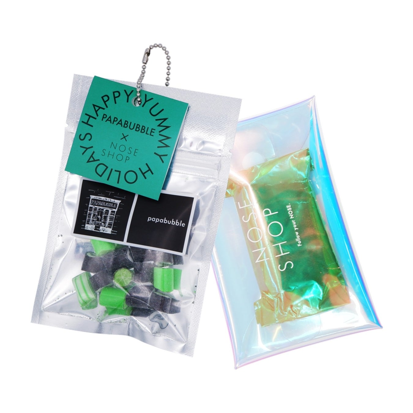 PAPABUBBLEの個性豊かな人気フレーバー、ライム、ミント、アニス(八角)を、NOSE SHOPのロゴが描かれたオリジナルキャンディと一緒に楽しめます。NOSE SHOPのブランドカラーである鮮やかなグリーンが目を引く、ホリデーシーズンのギフトにもぴったりなポップなデザインです。