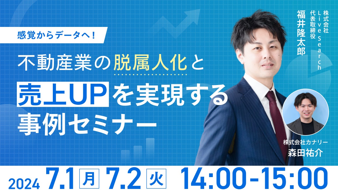 不動産会社向けに物件写真や間取り図DXサービスを開発・運営する株式会社Live Search(本社:福岡県福岡市中央区、代表取締役:福井 隆太郎/以下、「リブ・サーチ」)は、『感覚からデータへ!不動産業の"脱属人化"と売上アップを実現する事例セミナー』と題し、株式会社カナリー(本社:東京都千代田区、代表取締役:佐々木 拓輝)と共催オンラインセミナーを開催いたします。