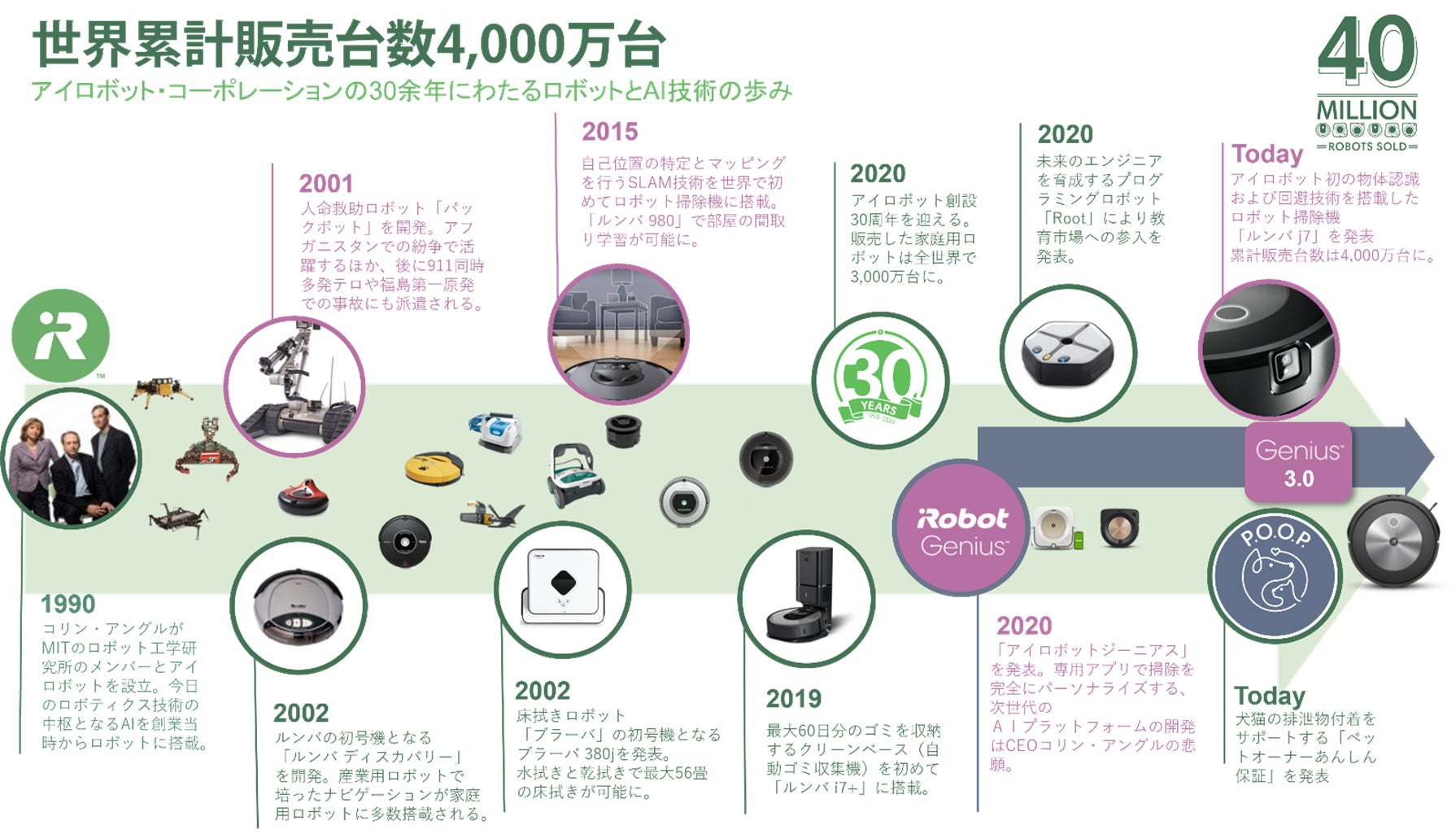 アイロボットジャパン合同会社(本社:東京都千代田区/代表執行役員社長 挽野元)は、アイロボット・コーポレーション(米国マサチューセッツ州)が、1990年の創設以来、家庭用ロボットの累計販売台数が世界で4,000万台*1を突破したことを発表いたします。