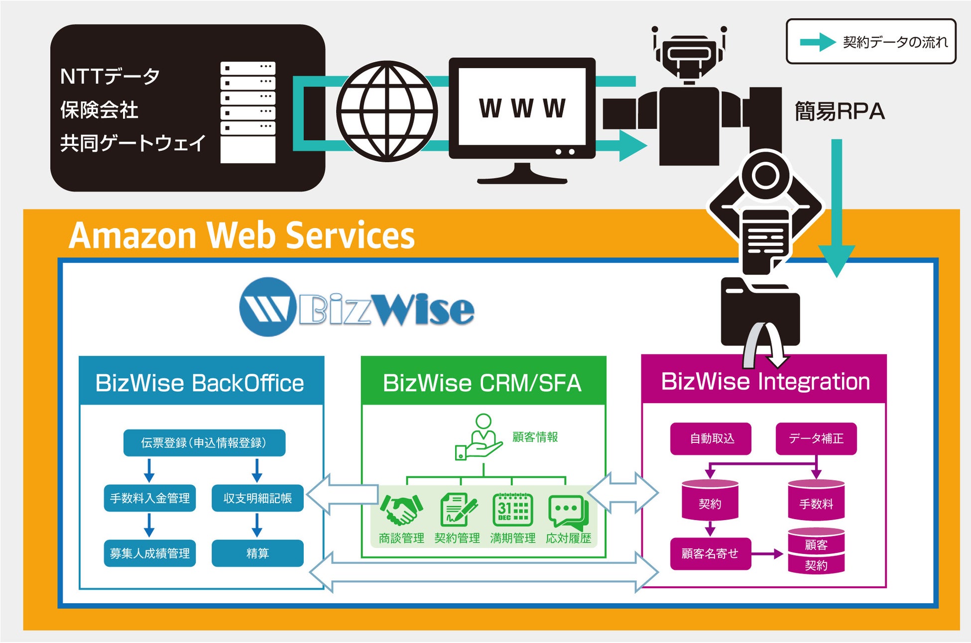 「BizWise®」は、株式会社NTTデータが約20年に亘り乗合保険代理店システムを開発・提供してきたノウハウを集約した保険代理店向けアプリ ケーションパッケージです。「BizWise®CRM/SFA」(顧客・契約管理等)、「BizWise®BackOffice」(各種伝票管理等)、「BizWise®Integration」 (各種データ自動連携・更新等)の3つのソリューションで構成し、保険代理店の業務効率化を支援します。お客様の状況に合わせたカスタマイズやア ドオン開発が可能で、システム全体を構築するパターン、既存の他システムと連携するパターン、勘定系機能のみを導入するパターンから選択できま す。最新バージョンでは、給与控除データを管理する「BizWise®C/O」(チェックオフ管理等)を搭載しています。 クロスキャットは、2021年8月、株式会社NTTデータと「BizWise®」のソフトウェア使用および改変許諾契約を締結し、保険代理店それぞれの生 産性向上や業務効率化に向けたニーズに応じた導入・活用の支援サービスを提供しています。