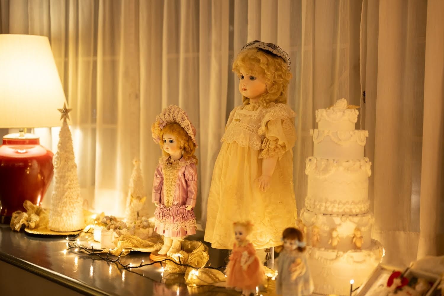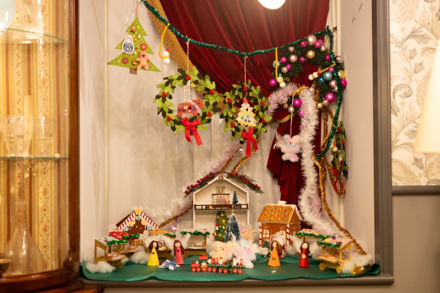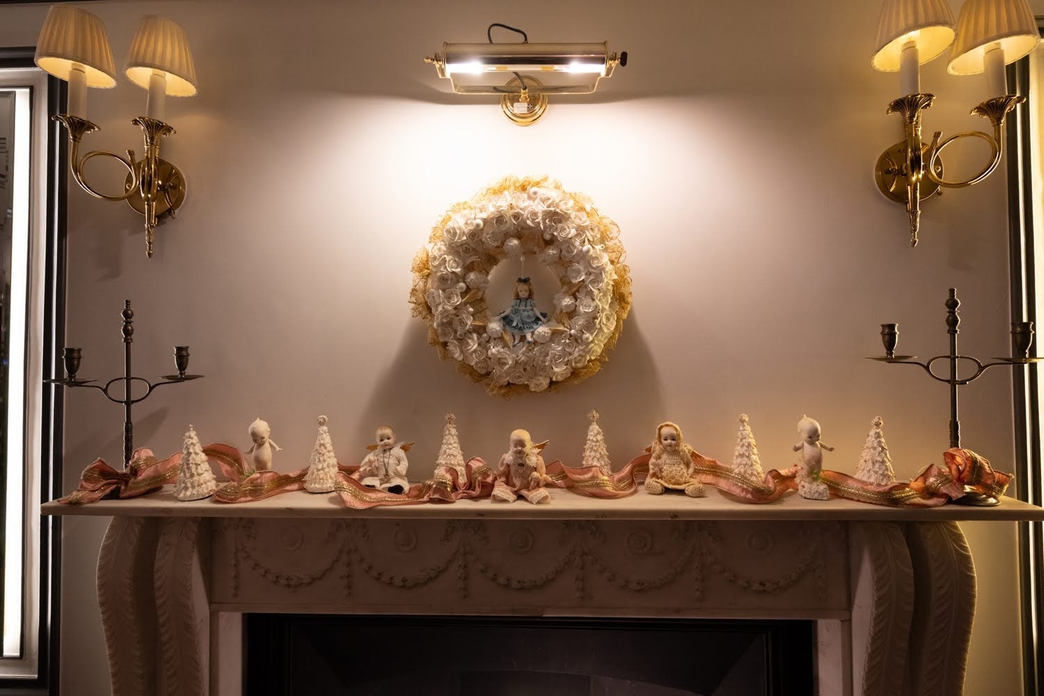 天使を想起させる赤ちゃんドールから大きなサイズまで異国情緒を感じさせるビスクドールが置かれた出窓(左上)、ローマ神話の愛の神であるキューピーを天使のイメージを重ねたビスクドールが並ぶマントルピース(右上)、子ども達も参加して作ったはりこ技法で作られた人形のクリスマスマーケット(左下)、ひとつひとつ手作りされた布花とレースの天使の羽が飾られたワイヤーツリー(右下)と、様々なデコレーションをお楽しみいただけます。これらの作品は、ホテルブティックにて販売しております。ご自宅用に、プレセントにと、幸せの品をお手元にどうぞ。