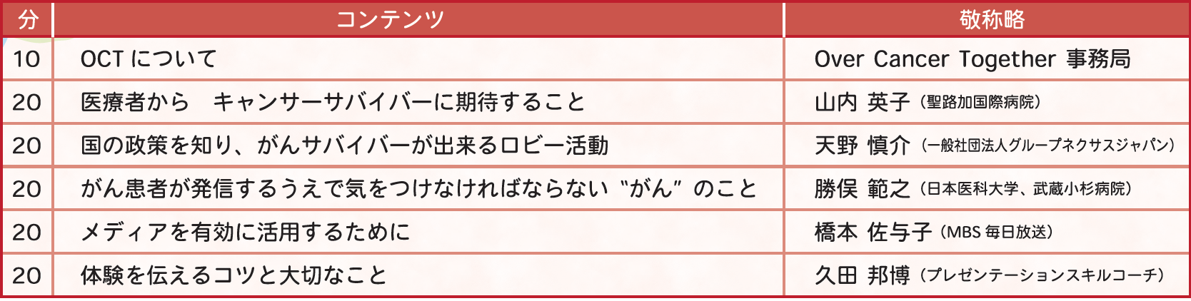 Over Cancer Together は、2013年リブストロング財団と米国がん協会のキャンサーサバイバーの草の根運動を支援する世界的な活動の一環として 、その趣旨に賛同した日本の多数の団体が協力しながら、「キャンサー・サバイバー・フォーラム」の開催などさまざまな活動を行ってきました。 これまで、このセミナーに参加した方のなかには、その後、患者支援やアドボカシー活動を始められた方、さらに国や自治体のがん対策推進協議会のメンバーになられた方もいらっしゃいます。ここで出会った仲間と繋がり、さらに活動の幅が広がります。全国のがんサバイバーが参加しやすいように、遠方の方には交通費の一部助成があります。最初の一歩を踏み出したいけど迷われている方、そんな方たちに是非参加していただきたいプログラムです。