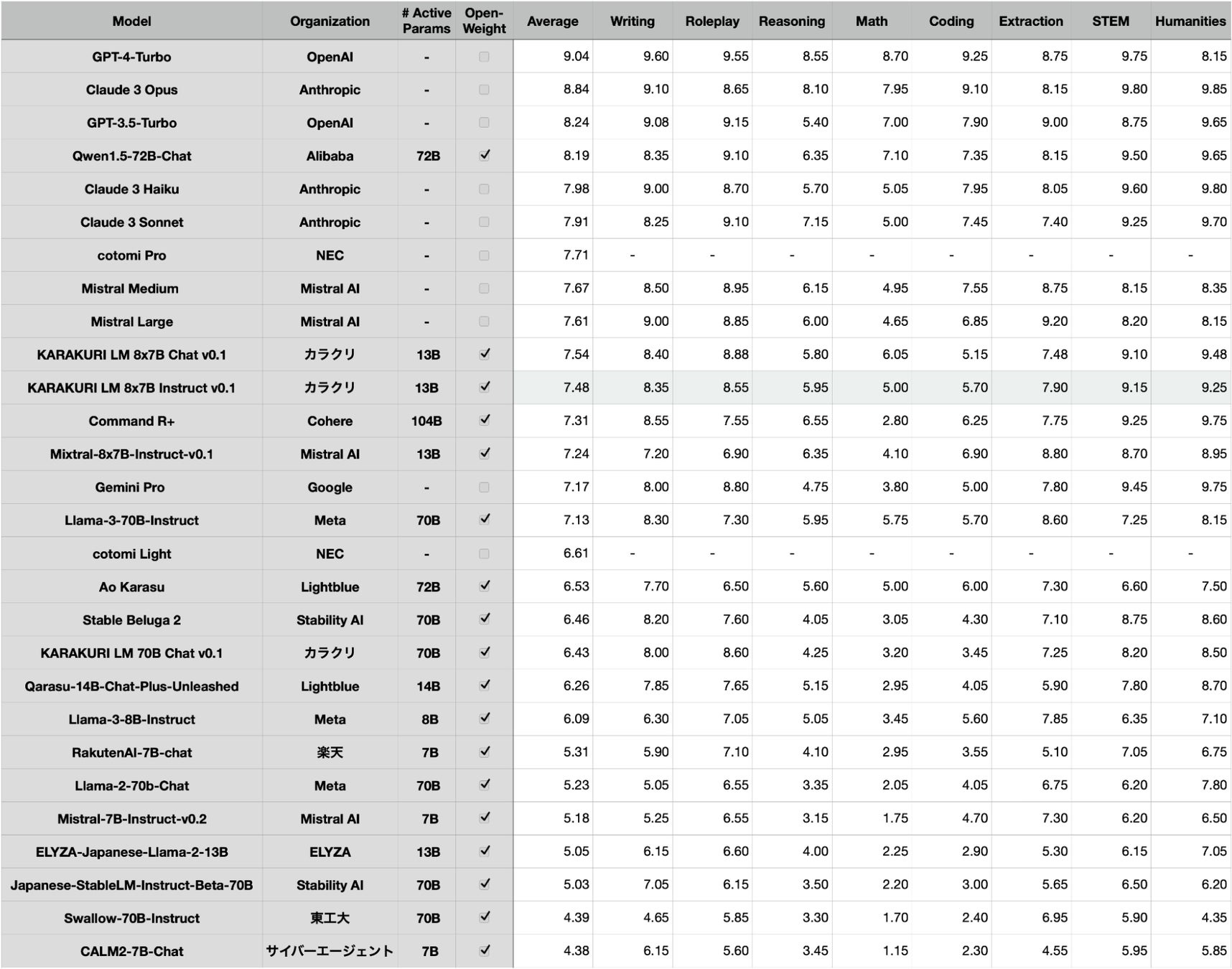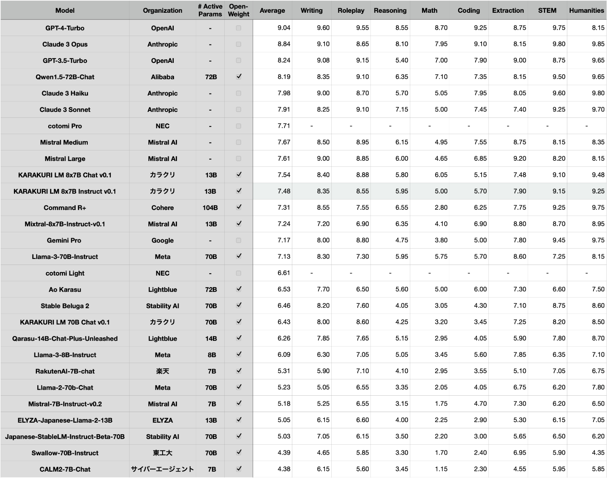カラクリは2023年9月に「AWS LLM 開発支援プログラム」に採択いただき、700億パラメーター「KARAKURI LM 70B Chat v0.1」の開発に着手、2024年1月に国産オープンモデルとして最高性能を獲得いたしました。その後、LLMの主流となっているMoE方式を採用し、「KARAKURI LM 8x7B Chat v0.1」を開発しております。