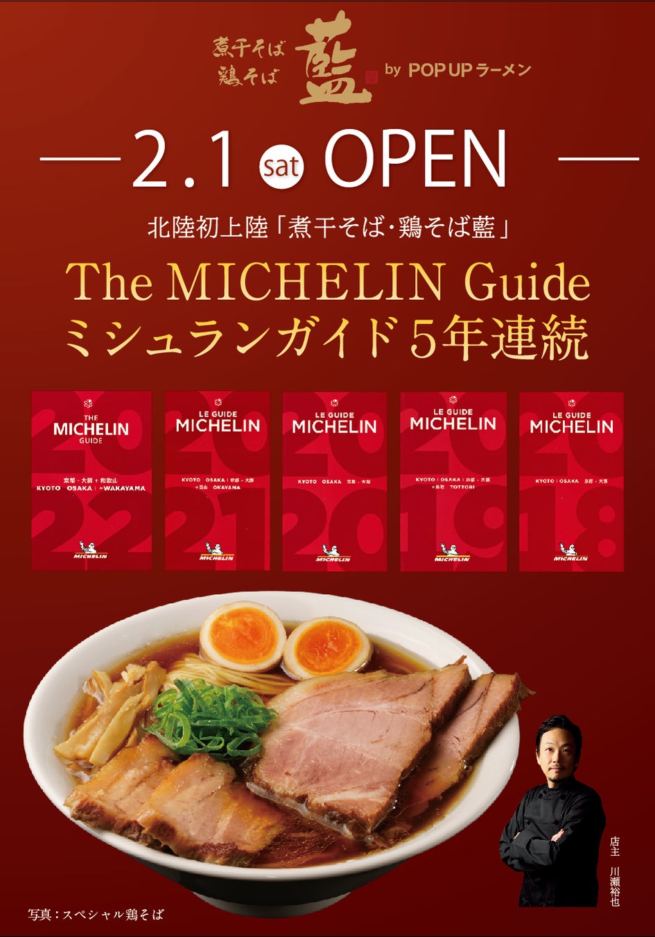リレー式ラーメン企画「POPUPラーメン アウトレットパーク 北陸小矢部店」第3弾は京都のだしを極めた人気店「煮干そば・鶏そば 藍」北陸初出店 2月1日オープン!