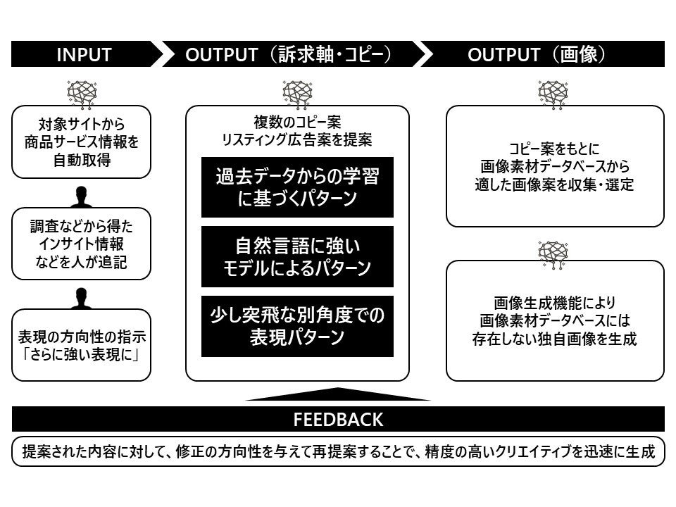 ●FEEDBACK:フィードバック機能を使い、提案内容を修正し再提案することで、精度の高いクリエイティブを迅速に生成。