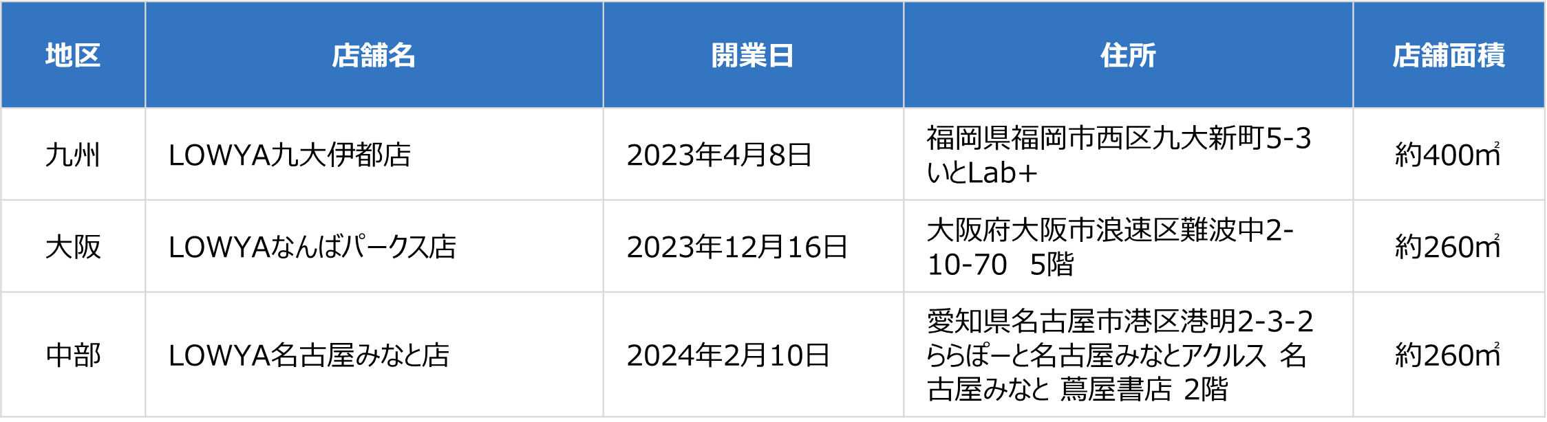 2023年4月には、1号店となる「LOWYA九大伊都店」をブランド誕生の地である九州に開業。同年12月には大阪のなんばに2号店、2024年2月には名古屋に3号店をオープンいたしました。