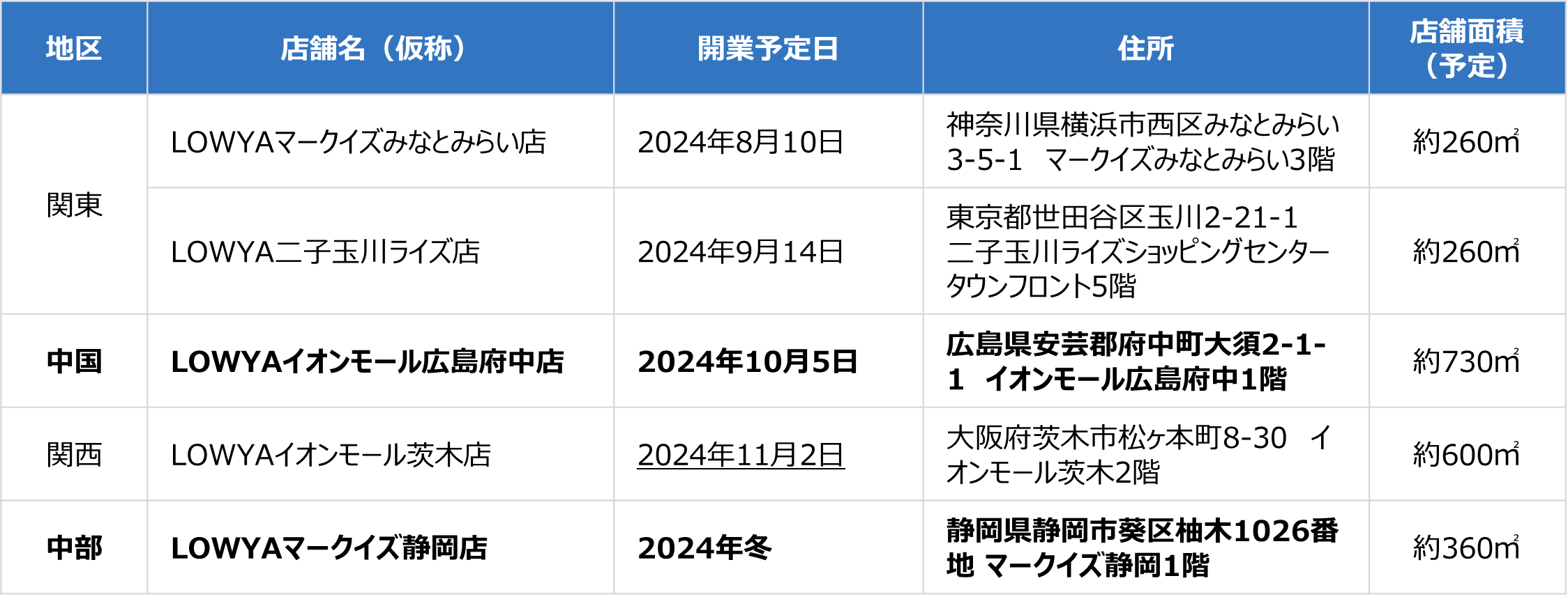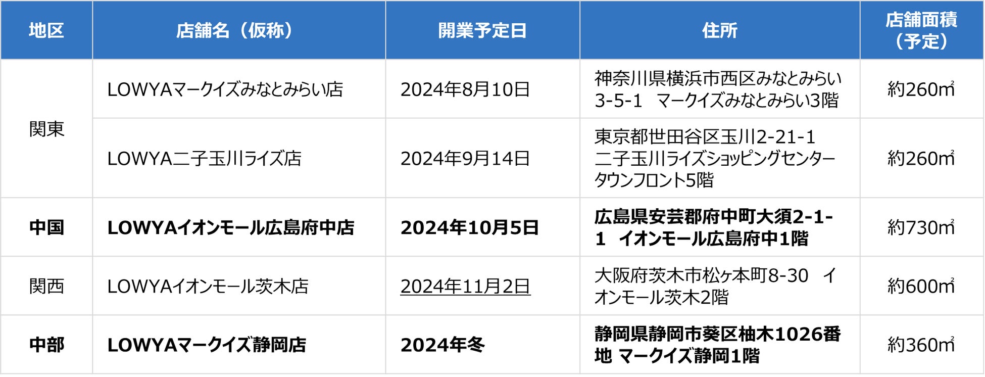 また、2024年10月に開業するLOWYAイオンモール広島府中店(仮称)に関しましては、店舗面積が約730㎡と、LOWYAの実店舗として最大の売り場面積となる予定です。