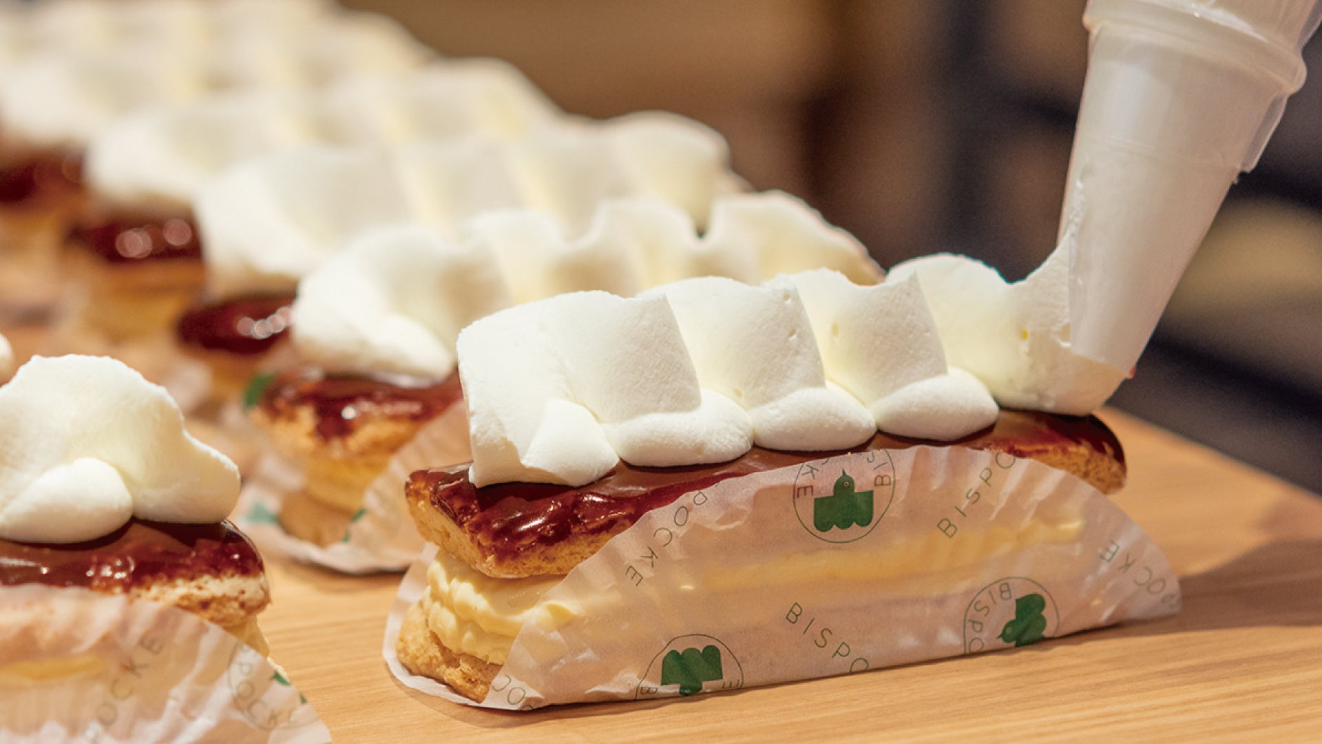 ビスポッケオリジナル配合のシュー生地にごろっと存在感のあるアーモンドとグラニュー糖をまぶし焼き上げることでキャラメリゼされたシューに。 ひとくちほおばれば、アーモンドの香ばしい味わいとジャージーミルクを使用した濃厚なカスタード、砂糖不使用生クリームの2種のクリームが楽しめます。