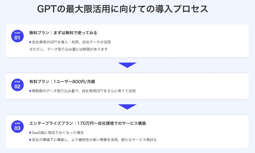 エンタープライズ版は受託開発を請け負うため、企業様ごとに見積もりをお出しいたします。初期費用は法人向けGPTサービスでは最安値で提供できる170万円(税抜)で、保守運用費として月額20万円(税抜)となります。その他オプションや各企業様独自の開発に関しては、別途見積をお出しします。