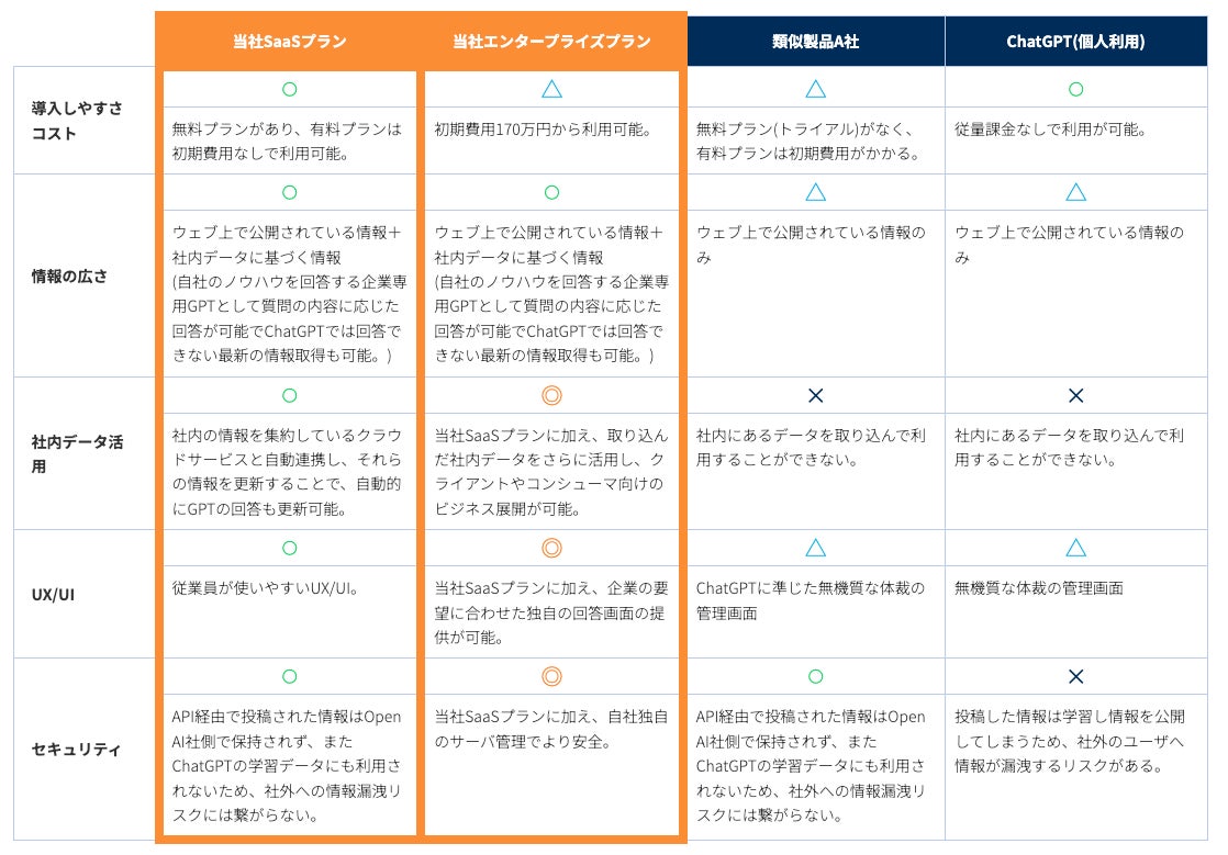 「ARSAGA INSIGHT ENGINE powed by GPT」エンタープライズ版は、他社類似サービスと比較した時に、コスト面での導入のしやすさ、UX/UIなどの面で優位性を持っています。