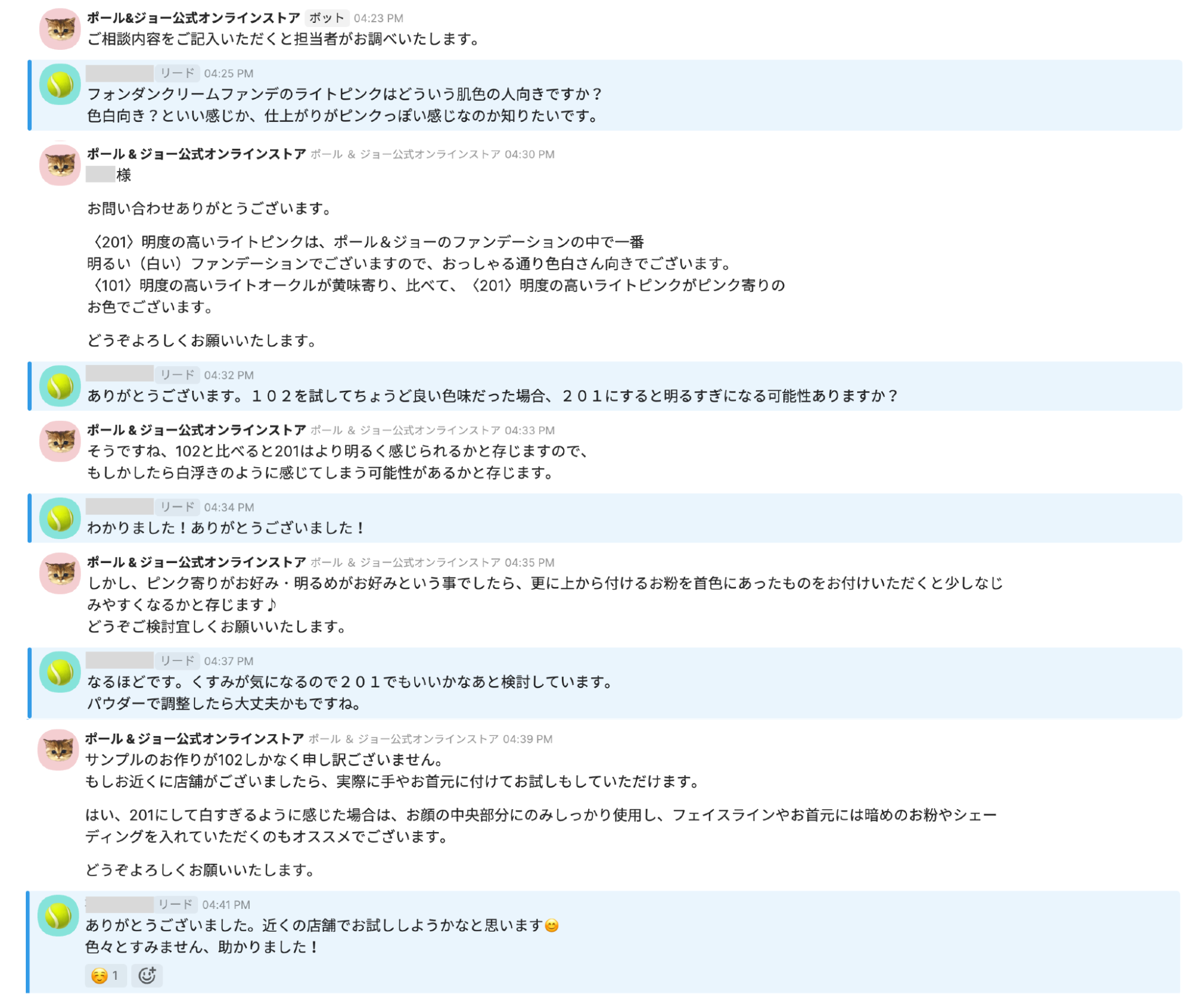 2つのサイトでは、実店舗にて美容部員を経験したスタッフが、お客様からの質問に単純に答えるだけでなく、お客様がご自身に合った商品に出会えるように、どのようなことを求めているのかをヒアリングしながらカウンセリング及び商品提案をしています。例えば、PAUL & JOE 公式オンラインストアでは、お客様がどんなメイクがしたいのかをヒアリングしたうえで商品をおすすめしています。どのような対応をどのような言葉で行っているのかを美容部員出身のCS担当者がチームに共有して、CS担当全員が実店舗同様のアドバイスができるよう心がけています。