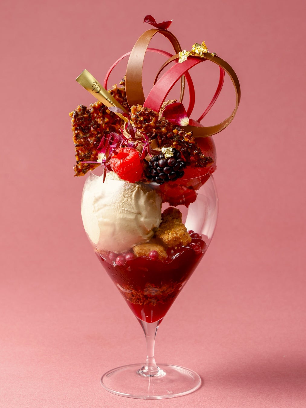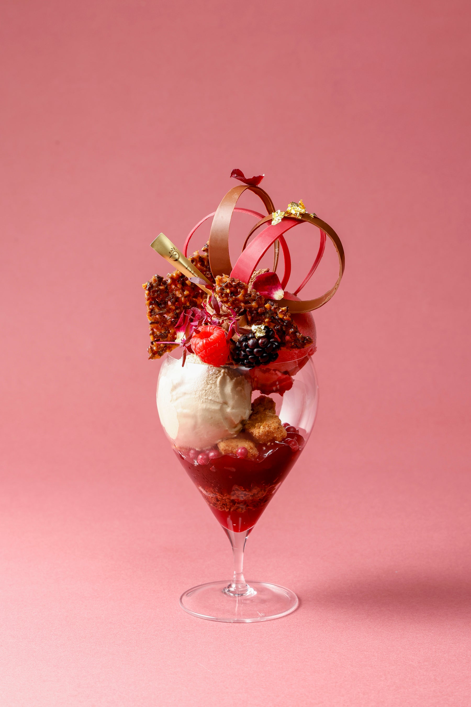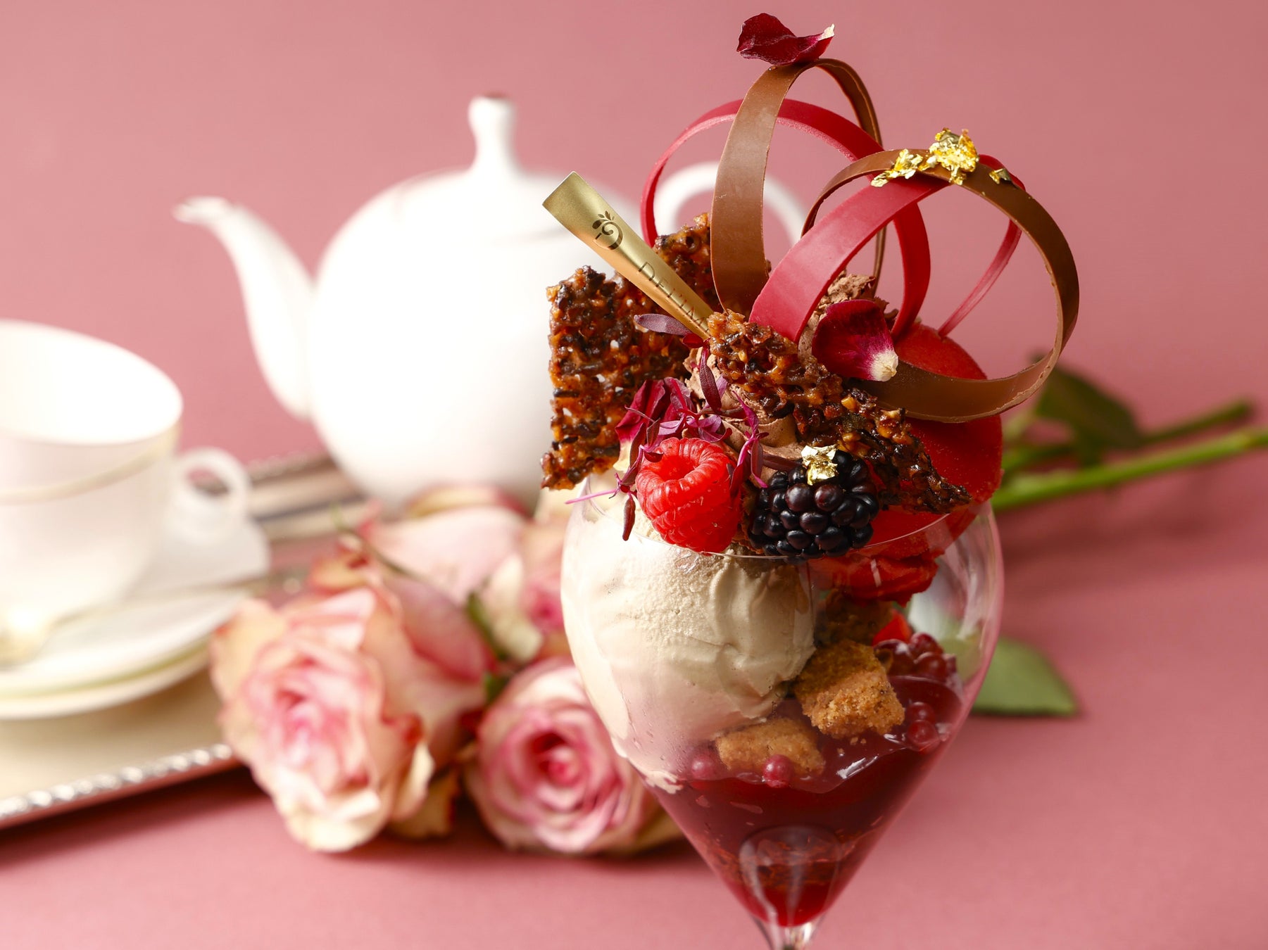 イギリス東インド会社のシェフパティシエである江口和明が提案する『紅茶×イチゴ×チョコレート』の組み合わせ。香り高いロイヤルミルクティーのアイス、濃厚なショコラクリームとベリーの酸味が調和した、世界でここでしか食べられない特別なパフェです。とろけるように柔らかく仕上げたジュレや店のオーブンで焼き上げるさくさくのクランブルなど、様々な食感が楽しめます。