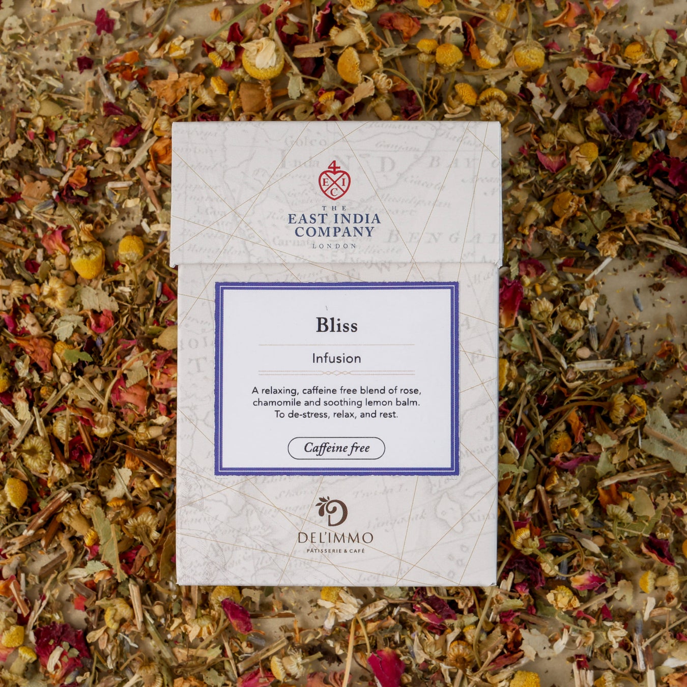 ストレスを和らげてゆっくりとした気分を促す、ローズ、カモミール、心地よいレモンバームをブレンドしたリラックスできるカフェインフリーのブレンドです。