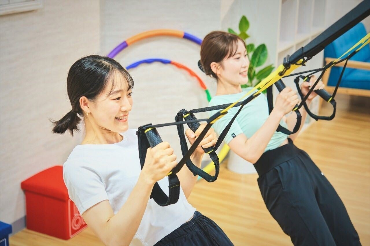レディーアップのスタジオは、女性が快適にトレーニングできる特別な空間です。TRXトレーニング用に設置された4つのサスペンションは、効率的かつ効果的なトレーニングを可能にし、最大4名まで同時にレッスンを受けられます。広々としたフィットネススペースは、明るく開放感があり、リラックスした雰囲気の中で運動に集中できます。